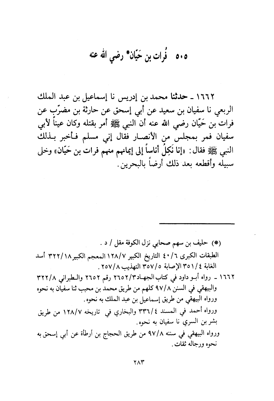 1662 - حَدَّثَنَا مُحَمَّدُ بْنُ إِدْرِيسَ، نا إِسْمَاعِيلُ بْنُ عَبْدِ الْمَلِكِ الرَّبَعِيُّ، نا سُفْيَانُ بْنُ سَعِيدٍ، عَنْ أَبِي إِسْحَاقَ، عَنْ حَارِثَةَ بْنِ مُضَرِّبٍ، عَنْ فُرَاتِ بْنِ حَيَّانَ، رَضِيَ اللَّهُ عَنْهُ، أَنَّ النَّبِيَّ صَلَّى اللهُ عَلَيْهِ وَسَلَّمَ أَمَرَ بِقَتْلِهِ وَكَانَ عَيْنًا لِأَبِي سُفْيَانَ فَمَرَّ بِمَجْلِسٍ الْأَنْصَارِ فَقَالَ: إِنِّي مُسْلِمٌ. فَأُخْبِرَ بِذَلِكَ النَّبِيُّ صَلَّى اللهُ عَلَيْهِ وَسَلَّمَ فَقَالَ: «§إِنَّا نَكِلُ أُنَاسًا إِلَى إِيمَانِهِمْ مِنْهُمْ فُرَاتُ بْنُ حَيَّانَ» وَخَلَّى سَبِيلَهُ وَأَقْطَعَهُ بَعْدَ ذَلِكَ أَرْضًا بِالْبَحْرَيْنِ