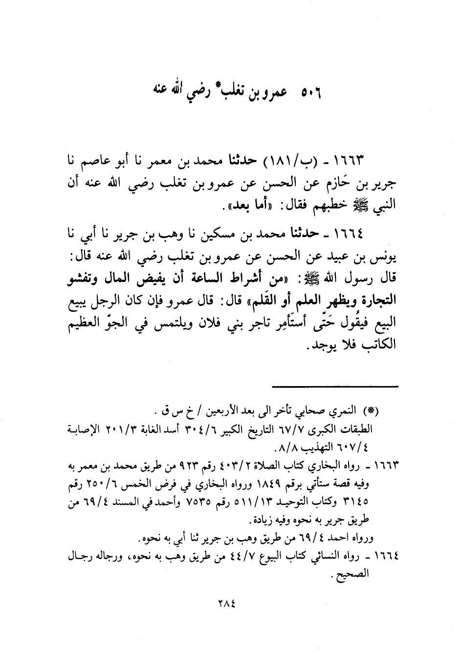1664 - حَدَّثَنَا مُحَمَّدُ بْنُ مِسْكِينٍ، نا وَهْبُ بْنُ جَرِيرٍ، نا أَبِي، نا يُونُسُ بْنُ عُبَيْدٍ، عَنِ الْحَسَنِ، عَنْ عَمْرِو بْنِ تَغْلِبَ، رَضِيَ اللَّهُ عَنْهُ قَالَ: قَالَ رَسُولُ اللَّهِ صَلَّى اللهُ عَلَيْهِ وَسَلَّمَ: «§مِنْ أَشْرَاطِ السَّاعَةِ أَنْ يَفِيضَ الْمَالُ وَتَفْشُو التِّجَارَةُ وَيَظْهَرَ الْعِلْمُ أَوِ الْقَلَمُ» قَالَ: قَالَ عَمْرٌو فَإِنْ كَانَ الرَّجُلُ يَبِيعُ الْبَيْعَ فَيَقُولُ: حَتَّى أَسْتَأْمِرَ تَاجِرَ بَنِي فُلَانٍ ويلتمس في الجو العظيم الكاتب فلا يوجد