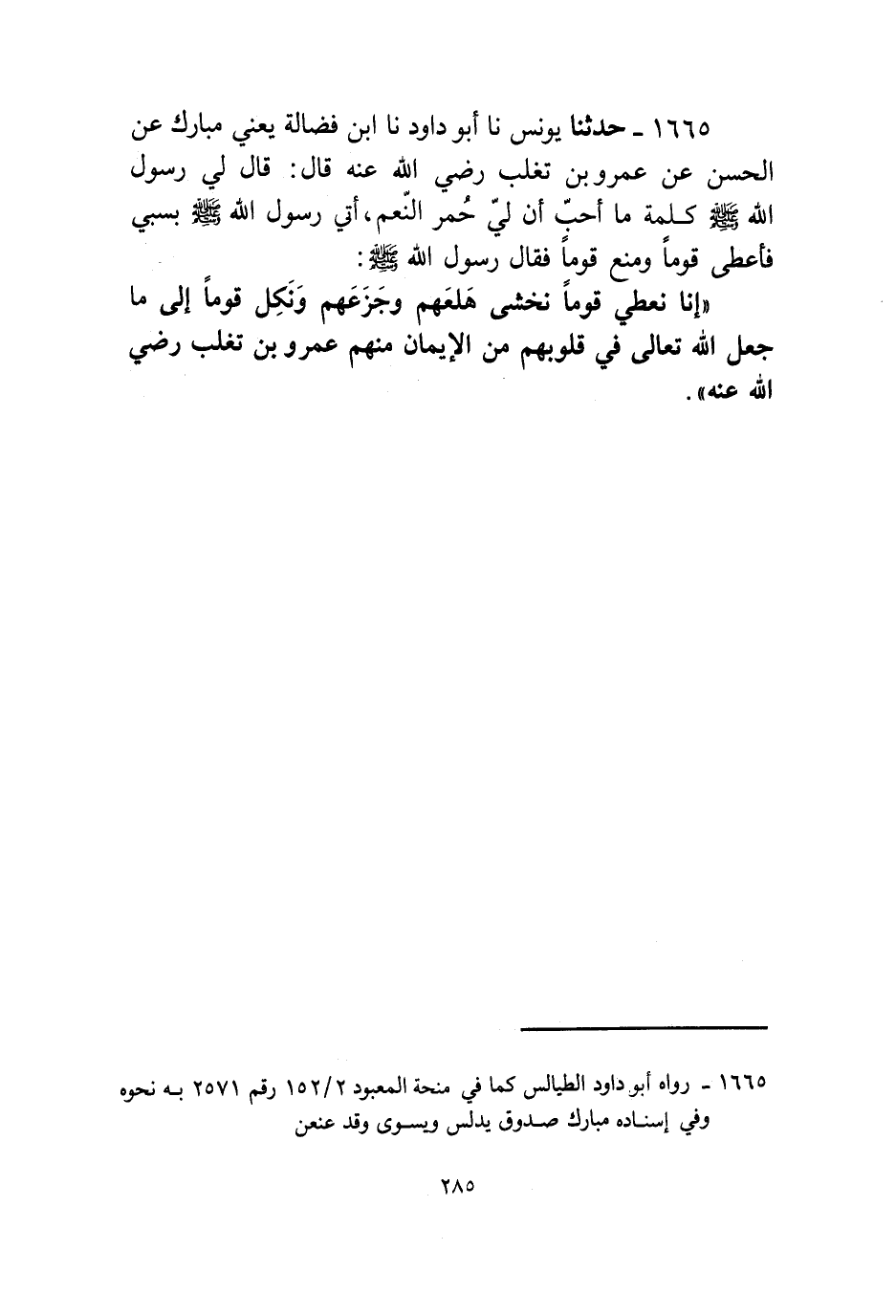 1665 - حَدَّثَنَا يُونُسُ، نا أَبُو دَاوُدَ، نا ابْنُ فَضَالَةَ يَعْنِي مُبَارَكًا، عَنِ الْحَسَنِ، عَنْ عَمْرِو بْنِ تَغْلِبَ، رَضِيَ اللَّهُ عَنْهُ قَالَ: قَالَ لِي رَسُولُ اللَّهِ صَلَّى اللهُ عَلَيْهِ وَسَلَّمَ: كَلِمَةٌ مَا أُحِبُّ أَنَّ لِي حُمْرُ النَّعَمِ " §أُتِيَ رَسُولُ اللَّهِ صَلَّى اللهُ عَلَيْهِ وَسَلَّمَ بِسَبْيٍ فَأَعْطَى قَوْمًا وَمَنَعَ قَوْمًا فَقَالَ رَسُولُ اللَّهِ صَلَّى اللهُ عَلَيْهِ وَسَلَّمَ: «إِنَّا نُعْطِي قَوْمًا نَخْشَى هَلَعَهُمْ وَجَزَعَهُمْ وَنَكِلُ قَوْمًا إِلَى مَا جَعَلَ اللَّهُ تَعَالَى فِي قُلُوبِهِمْ مِنَ الْإِيمَانِ؛ مِنْهُمْ عَمْرُو بْنُ تَغْلِبَ رَضِيَ اللَّهُ عَنْهُ»