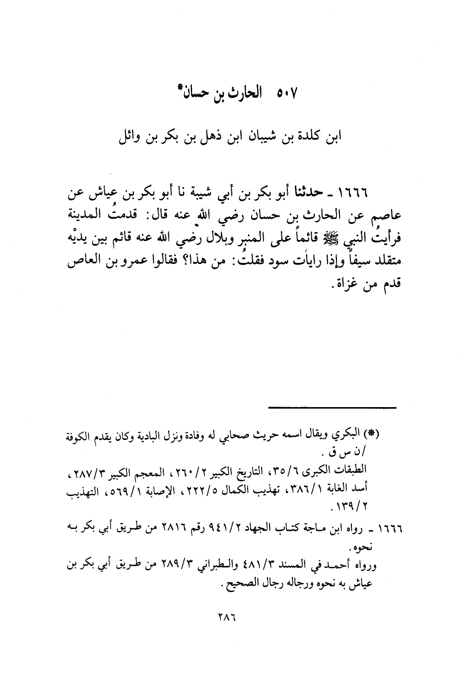 1666 - حَدَّثَنَا أَبُو بَكْرِ بْنُ أَبِي شَيْبَةَ، نا أَبُو بَكْرِ بْنُ عَيَّاشٍ، عَنْ عَاصِمٍ، عَنِ الْحَارِثِ بْنِ حَسَّانَ، رَضِيَ اللَّهُ عَنْهُ قَالَ: " §قَدِمْتُ الْمَدِينَةَ فَرَأَيْتُ النَّبِيَّ صَلَّى اللهُ عَلَيْهِ وَسَلَّمَ قَائِمًا عَلَى الْمِنْبَرِ وَبِلَالٌ رَضِيَ اللَّهُ عَنْهُ قَائِمٌ بَيْنَ يَدَيْهِ مُتَقَلِّدٌ سَيْفًا وَإِذَا رَايَاتٌ سُودٌ فَقُلْتُ: مَنْ هَذَا؟ فَقَالُوا: عَمْرُو بْنُ الْعَاصِ قَدِمَ مِنْ غَزَاةٍ "