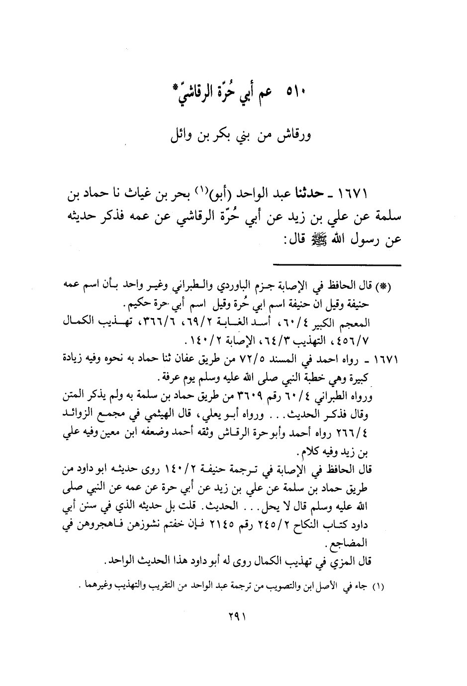 1671 - حَدَّثَنَا عَبْدُ الْوَاحِدِ أَبُو بَحْرِ بْنُ غِيَاثٍ، نا حَمَّادُ بْنُ سَلَمَةَ، عَنْ عَلِيِّ بْنِ زَيْدٍ، عَنْ أَبِي حُرَّةَ الرَّقَاشِيِّ، عَنْ عَمِّهِ، فَذَكَرَ حَدِيثَهُ عَنْ رَسُولِ اللَّهِ صَلَّى اللهُ عَلَيْهِ وَسَلَّمَ قَالَ -[292]-: «§لَا يَحِلُّ مَالُ امْرِئٍ مُسْلِمٍ إِلَّا عَنْ طِيبَةِ نَفْسٍ» قَالَ الْقَاضِي: إِنْ شَاءَ اللَّهُ اسْتِثْنَاءٌ فِي الْحِكَايَةِ