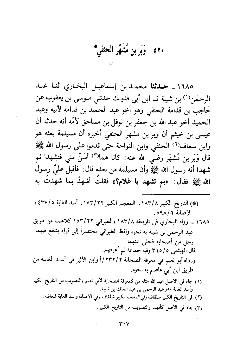 1685 - حَدَّثَنَا مُحَمَّدُ بْنُ إِسْمَاعِيلَ الْبُخَارِيُّ، ثنا عَبْدُ الرَّحْمَنِ بْنُ شَيْبَةَ، نا ابْنُ أَبِي فُدَيْكٍ، حَدَّثَنِي مُوسَى بْنُ يَعْقُوبَ، عَنْ حَاجِبِ بْنِ قُدَامَةَ الْحَنَفِيِّ وَهُوَ أَخُو عَبْدِ الْحَمِيدِ بْنِ قُدَامَةَ لِأَبِيهِ وَعَبْدُ الْحَمِيدِ أَخُو عَبْدِ اللَّهِ بْنِ جَعْفَرِ بْنِ نَوْفَلِ بْنِ مُسَاحِقٍ لِأُمِّهِ أَنَّهُ حَدَّثَهُ أَنَّ عِيسَى بْنَ خُثَيْمٍ، أَنَّ وَبَرَ بْنَ مُشْهِرٍ الْحَنَفِيَّ أَخْبَرَهُ أَنَّ مُسَيْلِمَةَ بَعَثَهُ هُوَ وَابْنَ شَعَافٍ الْحَنَفِيَّ وَابْنَ النَّوَّاحَةِ حَتَّى " §قَدِمُوا عَلَى رَسُولِ اللَّهِ صَلَّى اللهُ عَلَيْهِ وَسَلَّمَ قَالَ وَبَرُ بْنُ مُشَهِّرٍ رَضِيَ اللَّهُ عَنْهُ: كَانَا هُمَا أَسَنَّ مِنِّي فَتَشَهَّدَا ثُمَّ شَهِدَ أَنَّهُ رَسُولُ اللَّهِ صَلَّى اللهُ عَلَيْهِ وَسَلَّمَ وَأَنَّ مُسَيْلِمَةَ مِنْ بَعْدِهِ. قَالَ: فَأَقْبَلَ عَلَيَّ رَسُولُ اللَّهِ صَلَّى اللهُ عَلَيْهِ وَسَلَّمَ فَقَالَ: «بِمَ تَشْهَدُ يَا غُلَامُ؟» فَقُلْتُ: أَشْهَدُ بِمَا شَهِدْتَ بِهِ -[308]- وَأُكَذِّبُ بِمَا كَذَّبْتَ بِهِ. قَالَ: «فَإِنِّي أَشْهَدُ عَدَدَ تُرْبِ الدَّهْنَاءِ وَتُرْبِ يَثْرِبَ أَنَّ مُسَيْلِمَةَ كَذَّابٌ» . قَالَ وَبَرُ رَضِيَ اللَّهُ عَنْهُ: شَهِدْتُ بِمَا شَهِدْتَ بِهِ. فَقَالَ رَسُولُ اللَّهِ صَلَّى اللهُ عَلَيْهِ وَسَلَّمَ: «خُذُوهُمَا» . قَالَ: فَأُخِذَا فَأُخْرِجَ بِهِمَا إِلَى الْبَيْتِ يُحْبَسَانِ فَقَالَ رَجُلٌ: هَبْهُمَا لِي يَا رَسُولَ اللَّهِ. فَفَعَلَ فَخَرَجَا، وَأَقَامَ وَبَرُ بْنُ مُشَهِّرٍ عِنْدَ رَسُولِ اللَّهِ صَلَّى اللهُ عَلَيْهِ وَسَلَّمَ يَتَعَلَّمُ الْقُرْآنَ حَتَّى قُبِضَ رَسُولُ اللَّهِ صَلَّى اللهُ عَلَيْهِ وَسَلَّمَ وَرَجَعَ صَاحِبَاهُ " فَلَمَّا تُوُفِّيَ رَسُولُ اللَّهِ صَلَّى اللهُ عَلَيْهِ وَسَلَّمَ قَدِمَ وَبَرٌ رَضِيَ اللَّهُ عَنْهُ فَنَزَلَ عَلَى أُمِّهِ بِعَرْقَبَا فَسَمِعَ بِهِ مُسَيْلِمَةُ فَأَرْسَلَ إِلَيْهِ فَقَالَ: لَا يَرَانِي اللَّهُ تَعَالَى أَمْشِي إِلَيْهِ أَبَدًا. فَأَرْسَلَ إِلَيْهِ إِذًا لَأُدْمِيَنَّكَ فِي حِجْرِ أُمِّكَ. فَأَبَى فَأَصْرَفَ عَنْهُ حَتَّى جَاءَ خَالِدُ بْنُ الْوَلِيدِ رَضِيَ اللَّهُ عَنْهُ فَغَزَاهُ وَغَزَا مَعَهُ، وَقُتِلَ مُسَيْلِمَةُ وَخَرَجَ جَابِرُ بْنُ عَبْدِ اللَّهِ السُّلَمِيُّ