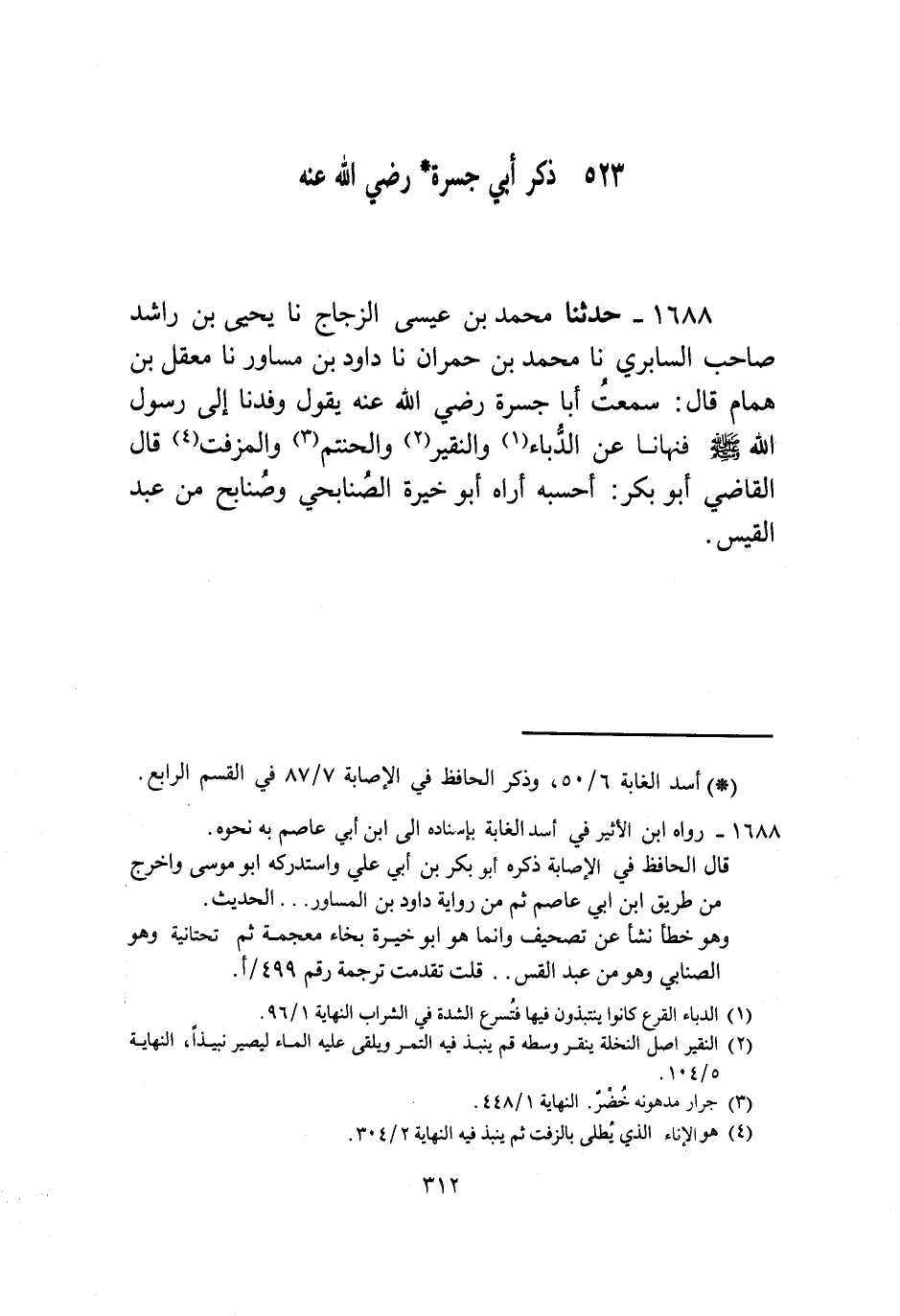 1688 - حَدَّثَنَا مُحَمَّدُ بْنُ عِيسَى الزَّجَّاجُ، نا يَحْيَى بْنُ رَاشِدٍ صَاحِبُ السَّابِرِيِّ، نا مُحَمَّدُ بْنُ حُمْرَانَ، نا دَاوُدُ بْنُ مُسَاوِرٍ، نا مَعْقِلُ بْنُ هَمَّامٍ قَالَ: سَمِعْتُ أَبَا جَسْرَةَ، رَضِيَ اللَّهُ عَنْهُ يَقُولُ: وَفَدْنَا إِلَى رَسُولِ اللَّهِ صَلَّى اللهُ عَلَيْهِ وَسَلَّمَ «§فَنَهَانَا عَنِ الدُّبَّاءِ وَالنَّقِيرِ وَالْحَنْتَمِ وَالْمُزَفَّتِ» قَالَ الْقَاضِي أَبُو بَكْرٍ: أَحْسِبُهُ أُرَاهُ أَبَا خَيْرَةَ الصُّنَابِحِيَّ وَصُنَابِحُ مِنْ عَبْدِ الْقَيْسِ "