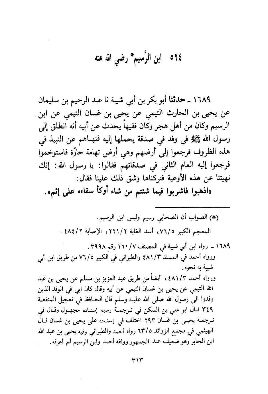1689 - حَدَّثَنَا أَبُو بَكْرِ بْنُ أَبِي شَيْبَةَ، نا عَبْدُ الرَّحِيمِ بْنُ سُلَيْمَانَ، عَنْ يَحْيَى بْنِ الْحَارِثِ التَّيْمِيِّ، عَنْ يَحْيَى بْنِ غَسَّانَ التَّيْمِيِّ، عَنِ ابْنِ الرَّسِيمِ وَكَانَ مِنْ أَهْلِ هَجَرٍ وَكَانَ فَقِيهًا يُحَدِّثُ عَنْ أَبِيهِ، أَنَّهُ انْطَلَقَ إِلَى رَسُولِ اللَّهِ صَلَّى اللهُ عَلَيْهِ وَسَلَّمَ فِي وَفْدٍ فِي صَدَقَةٍ يَحْمِلُهَا إِلَيْهِ فَنَهَاهُمْ عَنِ النَّبِيذِ فِي هَذِهِ الظُّرُوفِ فَرَجَعُوا إِلَى أَرْضِهِمْ وَهِيَ أَرْضُ تِهَامَةَ حَارَّةٌ فَاسْتَوْخَمُوا، فَرَجَعُوا إِلَيْهِ الْعَامَ الثَّانِي فِي صَدَقَاتِهِمْ فَقَالُوا: " §يَا رَسُولَ اللَّهِ، إِنَّكَ نَهَيْتَنَا عَنْ هَذِهِ الْأَوْعِيَةِ فَتَرَكْنَاهَا وَشَقَّ ذَلِكَ عَلَيْنَا. فَقَالَ: «اذْهَبُوا فَاشْرَبُوا فِيمَا شِئْتُمْ مَنْ شَاءَ أَوْكَأَ سِقَاءَهُ عَلَى إِثْمٍ»