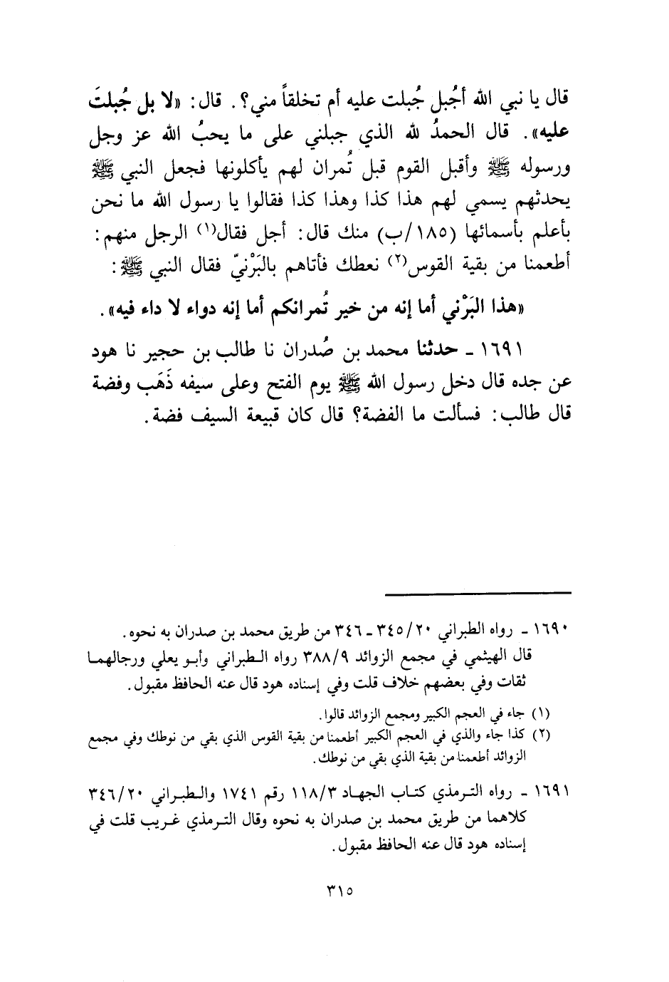 1691 - حَدَّثَنَا مُحَمَّدُ بْنُ صُدْرَانَ، نا طَالِبُ بْنُ حُجَيْرٍ، نا هُودٌ، عَنْ جَدِّهِ قَالَ: «§دَخَلَ رَسُولُ اللَّهِ صَلَّى اللهُ عَلَيْهِ وَسَلَّمَ يَوْمَ الْفَتْحِ وَعَلَى سَيْفِهِ ذَهَبٌ وَفِضَّةٌ» قَالَ طَالِبٌ: فَسَأَلْتُ مَا الْفِضَّةُ؟ قَالَ: كَانَ قَبِيعَةُ السَّيْفِ فِضَّةً "