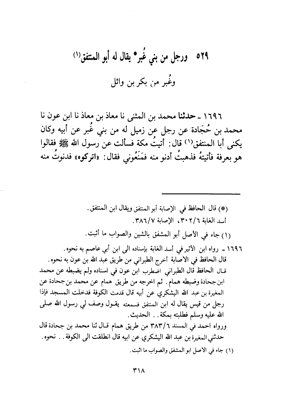 1696 - حَدَّثَنَا مُحَمَّدُ بْنُ الْمُثَنَّى، نا مُعَاذُ بْنُ مُعَاذٍ، نا ابْنُ عَوْنٍ، نا مُحَمَّدُ بْنُ جُحَادَةَ، عَنْ رَجُلٍ، عَنْ زَمِيلٍ لَهُ مِنْ بَنِي غُبَرَ، عَنْ أَبِيهِ وَكَانَ يُكْنَى أَبَا الْمُنْتَفِقِ قَالَ: أَتَيْتُ مَكَّةَ فَسَأَلْتُ عَنْ رَسُولِ اللَّهِ صَلَّى اللهُ عَلَيْهِ وَسَلَّمَ فَقَالُوا: هُوَ بِعَرَفَةَ فَأَتَيْتُهُ فَذَهَبْتُ أَدْنُو مِنْهُ فَمَنَعُونِي. فَقَالَ: «اتْرُكُوهُ» . فَدَنَوْتُ مِنْهُ -[319]- حَتَّى اخْتَلَفَ عُنُقُ رَاحِلَتَيَّ وَعُنُقُ رَاحِلَتِهِ فَقُلْتُ: " §يَا رَسُولَ اللَّهِ، نَبِّئْنِي بِمَا يُبَاعِدُنِي مِنْ عَذَابِ اللَّهِ تَعَالَى وَيُدْخِلُنِي الْجَنَّةَ. فَقَالَ: «تَعْبُدُ اللَّهَ وَلَا تُشْرِكُ بِهِ شَيْئًا، وَتُقِيمُ الصَّلَاةَ، وَأَدِّ الزَّكَاةَ الْمَفْرُوضَةَ، وَحُجَّ وَاعْتَمِرْ» - وَأَظُنُّهُ قَالَ: «وَصُمْ رَمَضَانَ، وَانْظُرْ مَا تُحِبُّ مِنَ النَّاسِ أَنْ يَأْتُوهُ إِلَيْكَ فَافْعَلْ بِهِمْ، وَمَا كَرِهْتَ أَنْ يَأْتُوهُ إِلَيْكَ فَذَرْهُمْ مِنْهُ» . قَالَ الْقَاضِي رَحِمَهُ اللَّهُ: وَفِي بَنِي شَيْبَانَ وَرَبِيعَةَ أَخْبَارٌ كَثِيرَةٌ وَفَضَائِلُ قَدْ ذَكَرْنَاهَا فِي مَوْضِعَهَا، مِنْهَا يَوْمُ قَارٍ وَغَيْرُ ذَلِكَ