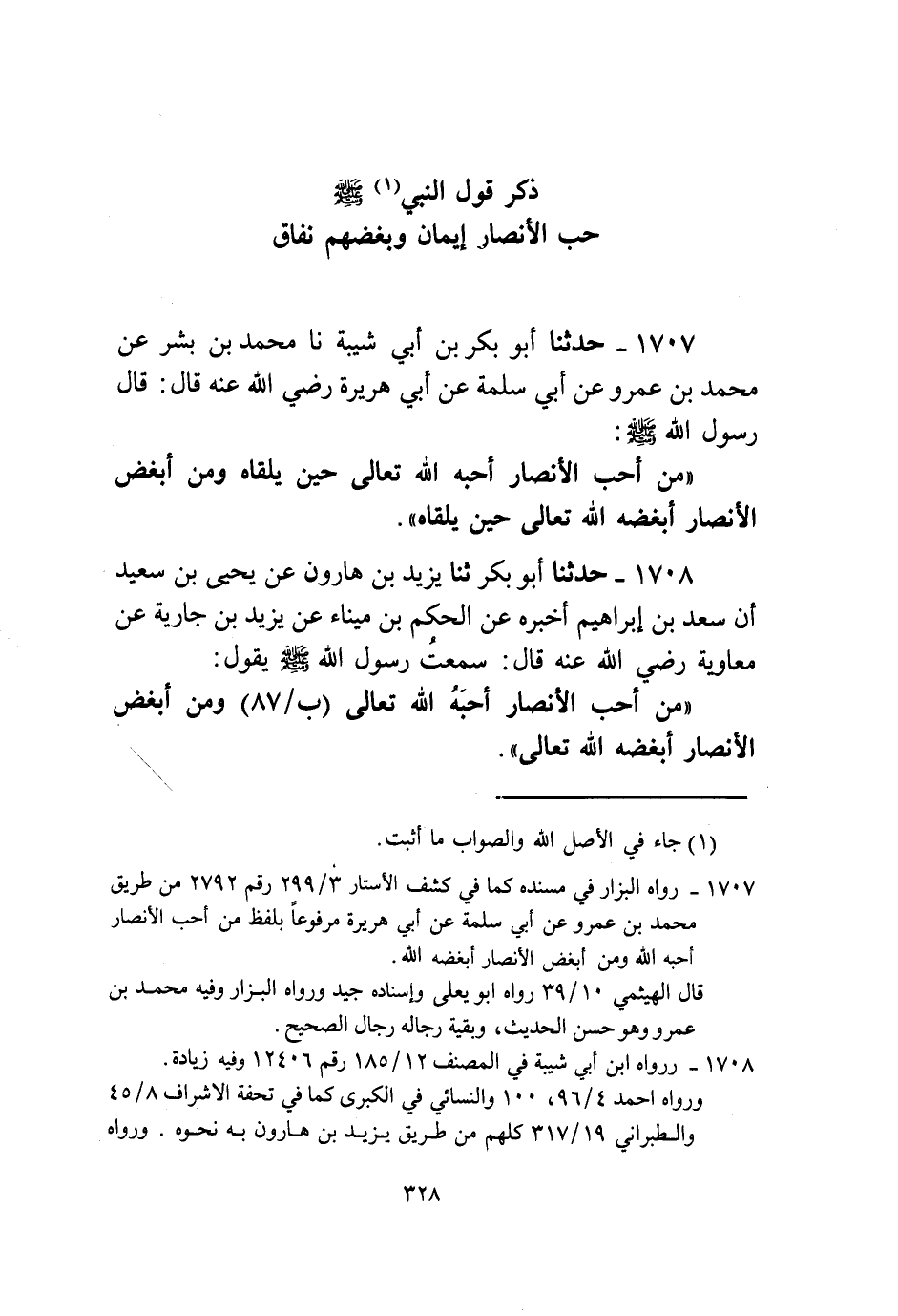 1707 - حَدَّثَنَا أَبُو بَكْرِ بْنُ أَبِي شَيْبَةَ، نا مُحَمَّدُ بْنُ بِشْرٍ، عَنْ مُحَمَّدِ بْنِ عَمْرٍو، عَنْ أَبِي سَلَمَةَ، عَنْ أَبِي هُرَيْرَةَ، رَضِيَ اللَّهُ عَنْهُ قَالَ: قَالَ رَسُولُ اللَّهِ صَلَّى اللهُ عَلَيْهِ وَسَلَّمَ: «§مَنْ أَحَبَّ الْأَنْصَارَ أَحَبَّهُ اللَّهُ تَعَالَى حِينَ يَلْقَاهُ، وَمَنْ أَبْغَضَ الْأَنْصَارَ أَبْغَضَهُ اللَّهُ تَعَالَى حِينَ يَلْقَاهُ»