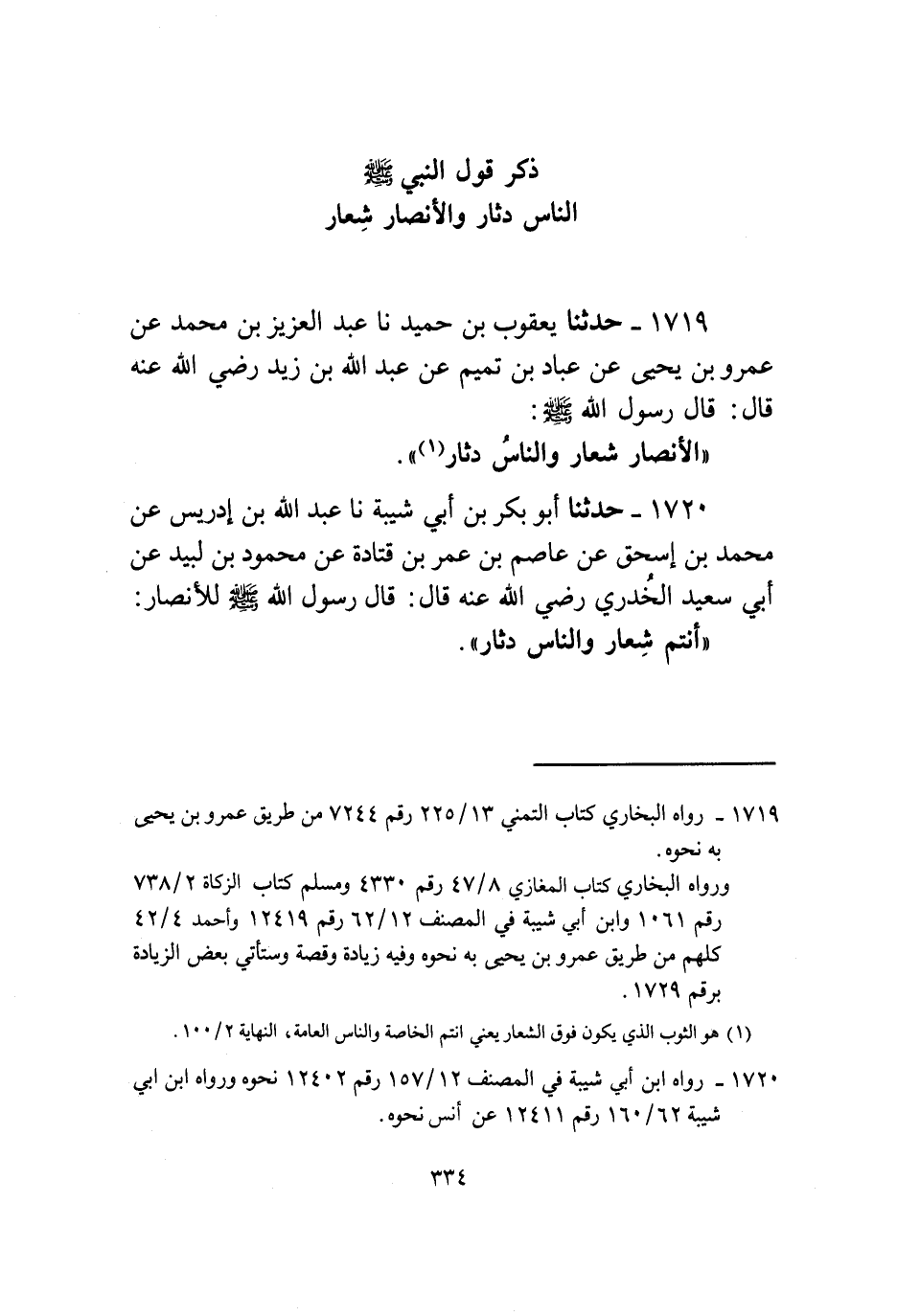 1719 - حَدَّثَنَا يَعْقُوبُ بْنُ حُمَيْدٍ، نا عَبْدُ الْعَزِيزِ بْنُ مُحَمَّدٍ، عَنْ عَمْرِو بْنِ يَحْيَى، عَنْ عَبَّادِ بْنِ تَمِيمٍ، عَنْ عَبْدِ اللَّهِ بْنِ زَيْدٍ، رَضِيَ اللَّهُ عَنْهُ قَالَ: قَالَ رَسُولُ اللَّهِ صَلَّى اللهُ عَلَيْهِ وَسَلَّمَ: «§الْأَنْصَارُ شِعَارٌ وَالنَّاسُ دِثَارٌ»