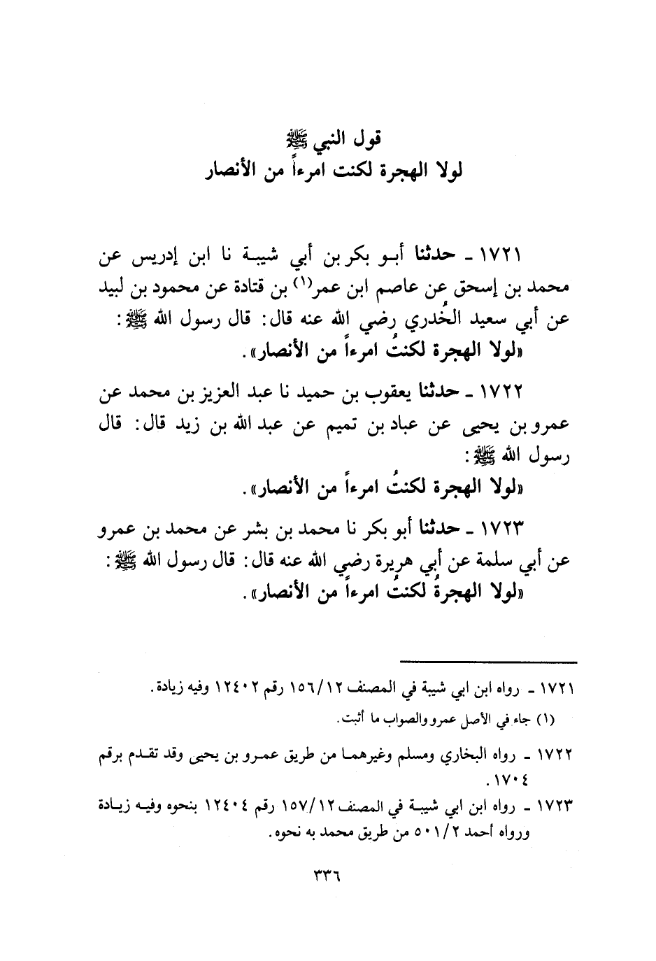 حَدَّثَنَا أَبُو بَكْرِ بْنُ أَبِي شَيْبَةَ، نا ابْنُ إِدْرِيسَ، عَنْ مُحَمَّدِ بْنِ إِسْحَاقَ، عَنْ عَاصِمِ بْنِ عُمَرَ بْنِ قَتَادَةَ، عَنْ مَحْمُودِ بْنِ لَبِيدٍ، عَنْ أَبِي سَعِيدٍ الْخُدْرِيِّ، رَضِيَ اللَّهُ عَنْهُ قَالَ: قَالَ رَسُولُ اللَّهِ صَلَّى اللهُ عَلَيْهِ وَسَلَّمَ: «§لَوْلَا الْهِجْرَةُ لَكُنْتُ امْرَأً مِنَ الْأَنْصَارِ»