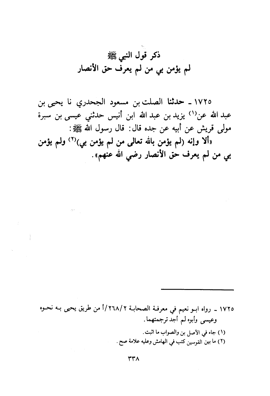 1725 - حَدَّثَنَا الصَّلْتُ بْنُ مَسْعُودٍ الْجَحْدَرِيُّ، نا يَحْيَى بْنُ عَبْدِ اللَّهِ بْنِ يَزِيدَ بْنِ عَبْدِ اللَّهِ بْنِ أُنَيْسٍ، حَدَّثَنِي عِيسَى بْنُ سَبْرَةَ مَوْلَى قُرَيْشٍ، عَنْ أَبِيهِ، عَنْ جَدِّهِ قَالَ: قَالَ رَسُولُ اللَّهِ صَلَّى اللهُ عَلَيْهِ وَسَلَّمَ: «§أَلَا وَإِنَّهُ لَمْ يُؤْمِنْ بِاللَّهِ تَعَالَى مَنْ لَمْ يُؤْمِنْ بِي، وَلَمْ يُؤْمِنْ بِي مَنْ لَمْ يَعْرِفْ حَقَّ الْأَنْصَارِ رَضِيَ اللَّهُ عَنْهُمْ»