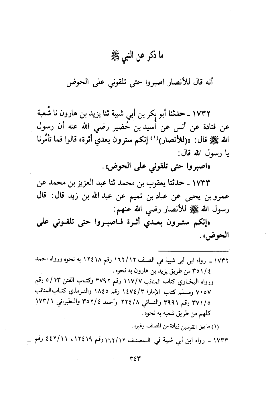 1732 - حَدَّثَنَا أَبُو بَكْرِ بْنُ أَبِي شَيْبَةَ، ثنا يَزِيدُ بْنُ هَارُونَ، نا شُعْبَةُ، عَنْ قَتَادَةَ، عَنْ أَنَسٍ، عَنْ أُسَيْدِ بْنِ حُضَيْرٍ رَضِيَ اللَّهُ عَنْهُ، أَنَّ رَسُولَ اللَّهِ صَلَّى اللهُ عَلَيْهِ وَسَلَّمَ قَالَ لِلْأَنْصَارِ: «§إِنَّكُمْ سَتَرَوْنَ بَعْدِي أَثَرَةً» . قَالُوا: فَمَا تَأْمُرُنَا يَا رَسُولَ اللَّهِ؟ قَالَ: «اصْبِرُوا حَتَّى تَلْقَوْنِي عَلَى الْحَوْضِ»