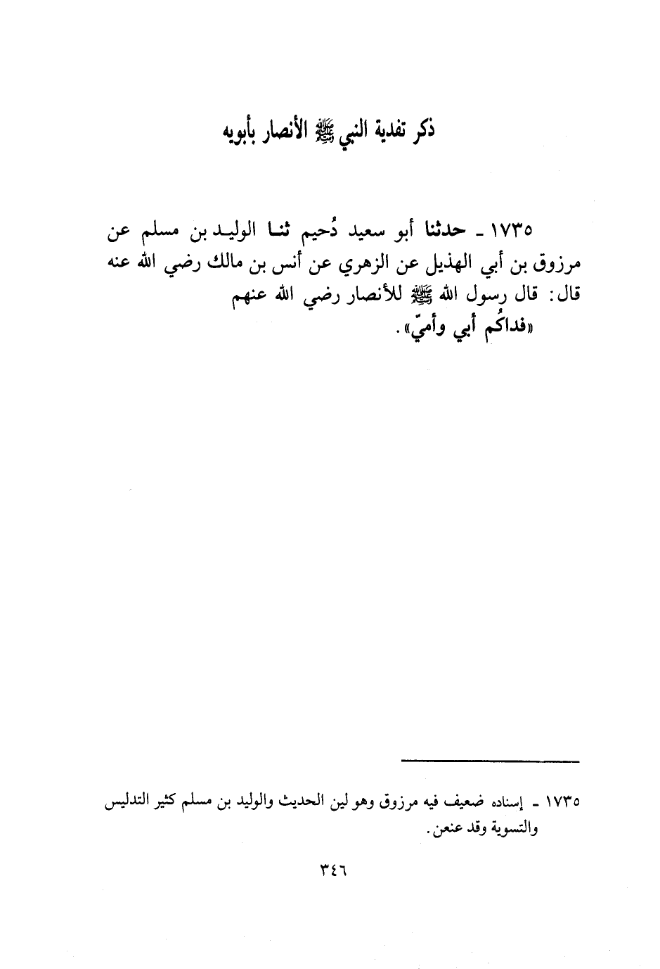 1735 - حَدَّثَنَا أَبُو سَعِيدٍ دُحَيْمٌ، ثنا الْوَلِيدُ بْنُ مُسْلِمٍ، عَنْ مَرْزُوقِ بْنِ أَبِي الْهُذَيْلِ، عَنِ الزُّهْرِيِّ، عَنْ أَنَسِ بْنِ مَالِكٍ، رَضِيَ اللَّهُ عَنْهُ قَالَ: " §قَالَ رَسُولُ اللَّهِ صَلَّى اللهُ عَلَيْهِ وَسَلَّمَ لِلْأَنْصَارِ رَضِيَ اللَّهُ عَنْهُمْ: «فَدَاكُمْ أَبِي وَأُمِّي»