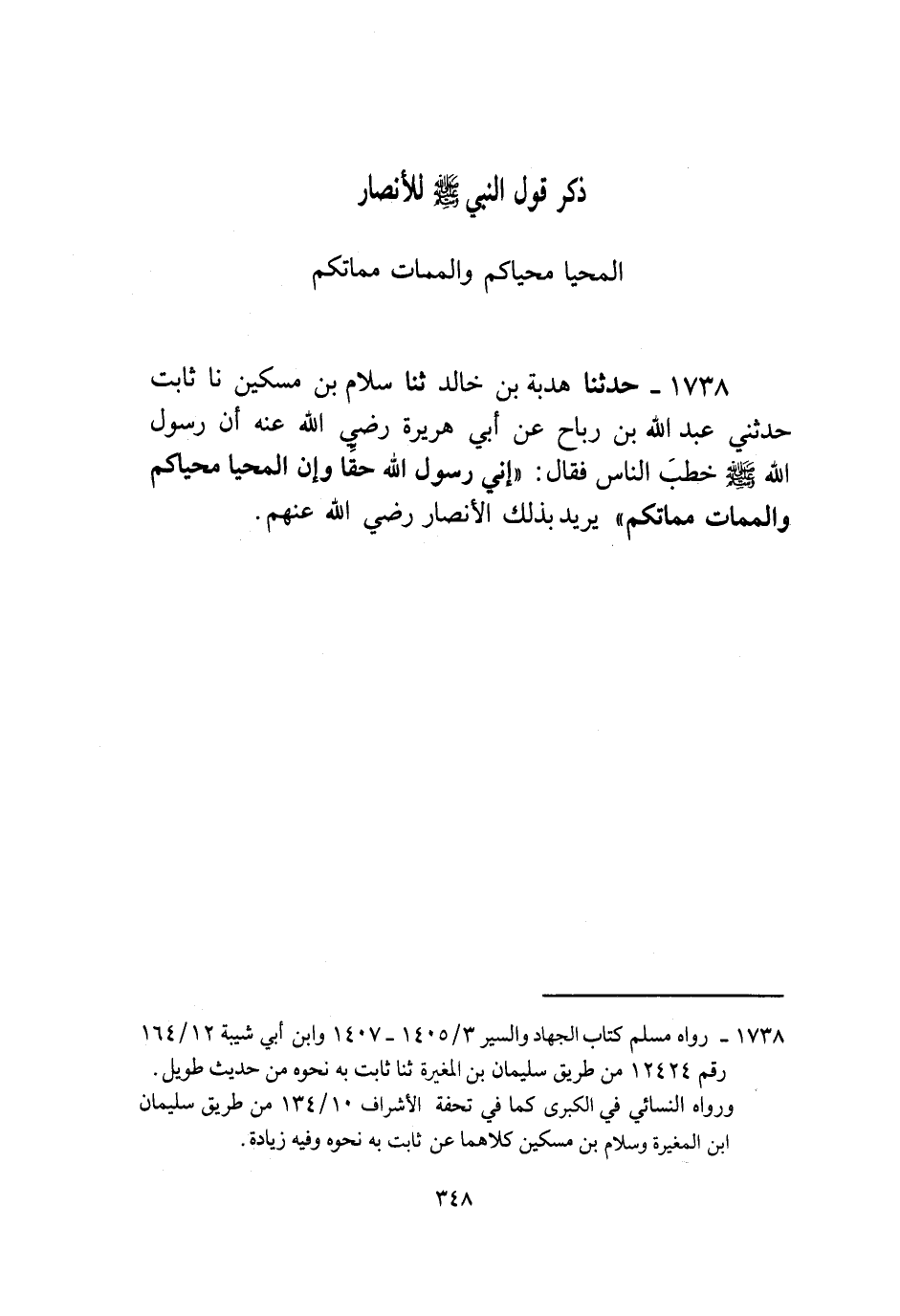 1738 - حَدَّثَنَا هُدْبَةُ بْنُ خَالِدٍ، ثنا سَلَّامُ بْنُ مِسْكِينٍ، نا ثَابِتٌ، حَدَّثَنِي عَبْدُ اللَّهِ بْنُ رَبَاحٍ، عَنْ أَبِي هُرَيْرَةَ رَضِيَ اللَّهُ عَنْهُ، أَنَّ رَسُولَ اللَّهِ صَلَّى اللهُ عَلَيْهِ وَسَلَّمَ خَطَبَ النَّاسَ فَقَالَ: «§إِنِّي رَسُولُ اللَّهِ حَقًّا وَإِنَّ الْمَحْيَا مَحْيَاكُمْ وَالْمَمَاتُ مَمَاتُكُمْ» يُرِيدُ بِذَلِكَ الْأَنْصَارَ رَضِيَ اللَّهُ عَنْهُمْ