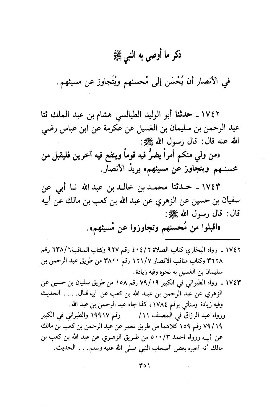 1742 - حَدَّثَنَا أَبُو الْوَلِيدِ الطَّيَالِسِيُّ هِشَامُ بْنُ عَبْدِ الْمَلِكِ، ثنا عَبْدُ الرَّحْمَنِ بْنُ سُلَيْمَانَ بْنِ الْغَسِيلِ، عَنْ عَكْرُمَةَ، عَنِ ابْنِ عَبَّاسٍ، رَضِيَ اللَّهُ عَنْهُ قَالَ: قَالَ رَسُولُ اللَّهِ صَلَّى اللهُ عَلَيْهِ وَسَلَّمَ: «§مَنْ وَلِيَ مِنْكُمْ أَمْرًا يَضُرُّ فِيهِ قَوْمًا وَيَنْفَعُ فِيهِ آخَرِينَ فَلْيَقْبَلْ مِنْ مُحْسِنِهِمْ وَيَتَجَاوَزْ عَنْ مُسِيئِهِمْ» يُرِيدُ الْأَنْصَارَ