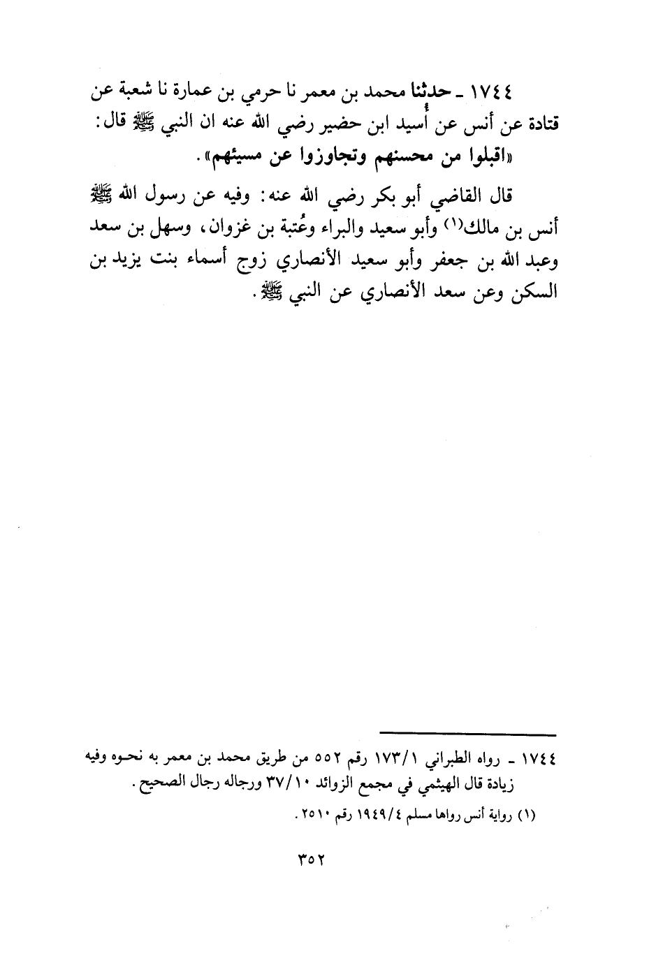 1744 - حَدَّثَنَا مُحَمَّدُ بْنُ مَعْمَرٍ، نا حِرْمِيُّ بْنُ عُمَارَةَ، نا شُعْبَةُ، عَنْ قَتَادَةَ، عَنْ أَنَسٍ، عَنْ أُسَيْدِ بْنِ حُضَيْرٍ رَضِيَ اللَّهُ عَنْهُ، أَنَّ النَّبِيَّ صَلَّى اللهُ عَلَيْهِ وَسَلَّمَ قَالَ: «§اقْبَلُوا مِنْ مُحْسِنِهِمْ وَتَجَاوَزُوا عَنْ مُسِيئِهِمْ» قَالَ الْقَاضِي أَبُو بَكْرٍ رَضِيَ اللَّهُ عَنْهُ: وَفِيهِ عَنْ رَسُولِ اللَّهِ صَلَّى اللهُ عَلَيْهِ وَسَلَّمَ أَنَسُ بْنُ مَالِكٍ وَأَبُوسَعِيدٍ وَالْبَرَاءُ وَعُتْبَةُ بْنُ غَزْوَانَ وَسَهْلُ بْنُ سَعْدٍ وَعَبْدُ اللَّهِ بْنُ جَعْفَرٍ وَأَبُو سَعِيدٍ الْأَنْصَارِيُّ زَوْجُ أَسْمَاءَ بِنْتِ يَزِيدَ بْنِ السَّكَنِ وَعَنْ سَعْدٍ الْأَنْصَارِيِّ، عَنِ النَّبِيِّ صَلَّى اللهُ عَلَيْهِ وَسَلَّمَ