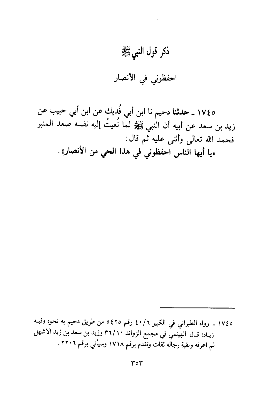 1745 - حَدَّثَنَا دُحَيْمٌ، نا ابْنُ أَبِي فُدَيْكٍ، عَنِ ابْنِ أَبِي حَبِيبٍ، عَنْ زَيْدِ بْنِ سَعْدٍ، عَنْ أَبِيهِ، أَنَّ النَّبِيَّ صَلَّى اللهُ عَلَيْهِ وَسَلَّمَ لَمَّا نُعِيَتْ إِلَيْهِ نَفْسُهُ صَعِدَ الْمِنْبَرَ فَحَمِدَ اللَّهَ تَعَالَى وَأَثْنَى عَلَيْهِ ثُمَّ قَالَ: «§يَا أَيُّهَا النَّاسُ احْفَظُونِي فِي هَذَا الْحَيِّ مِنَ الْأَنْصَارِ»