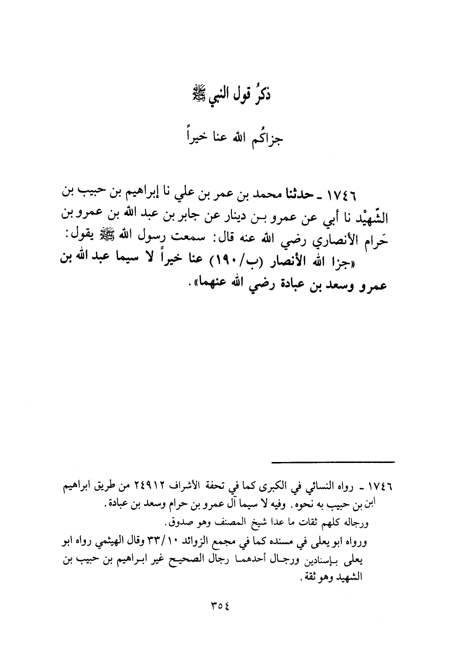 1746 - حَدَّثَنَا مُحَمَّدُ بْنُ عُمَرَ بْنِ عَلِيٍّ، نا إِبْرَاهِيمُ بْنُ حَبِيبِ بْنِ الشَّهِيدِ، نا أَبِي، عَنْ عَمْرِو بْنِ دِينَارٍ، عَنْ جَابِرِ بْنِ عَبْدِ اللَّهِ بْنِ عَمْرِو بْنِ حَرَامٍ الْأَنْصَارِيِّ، رَضِيَ اللَّهُ عَنْهُ قَالَ: سَمِعْتُ رَسُولَ اللَّهِ صَلَّى اللهُ عَلَيْهِ وَسَلَّمَ يَقُولُ: «§جَزَى اللَّهُ الْأَنْصَارَ عَنَّا خَيْرًا، لَا سِيَّمَا عَبْدُ اللَّهِ بْنُ عَمْرٍو وَسَعْدُ بْنُ عُبَادَةَ رَضِيَ اللَّهُ عَنْهُمَا»