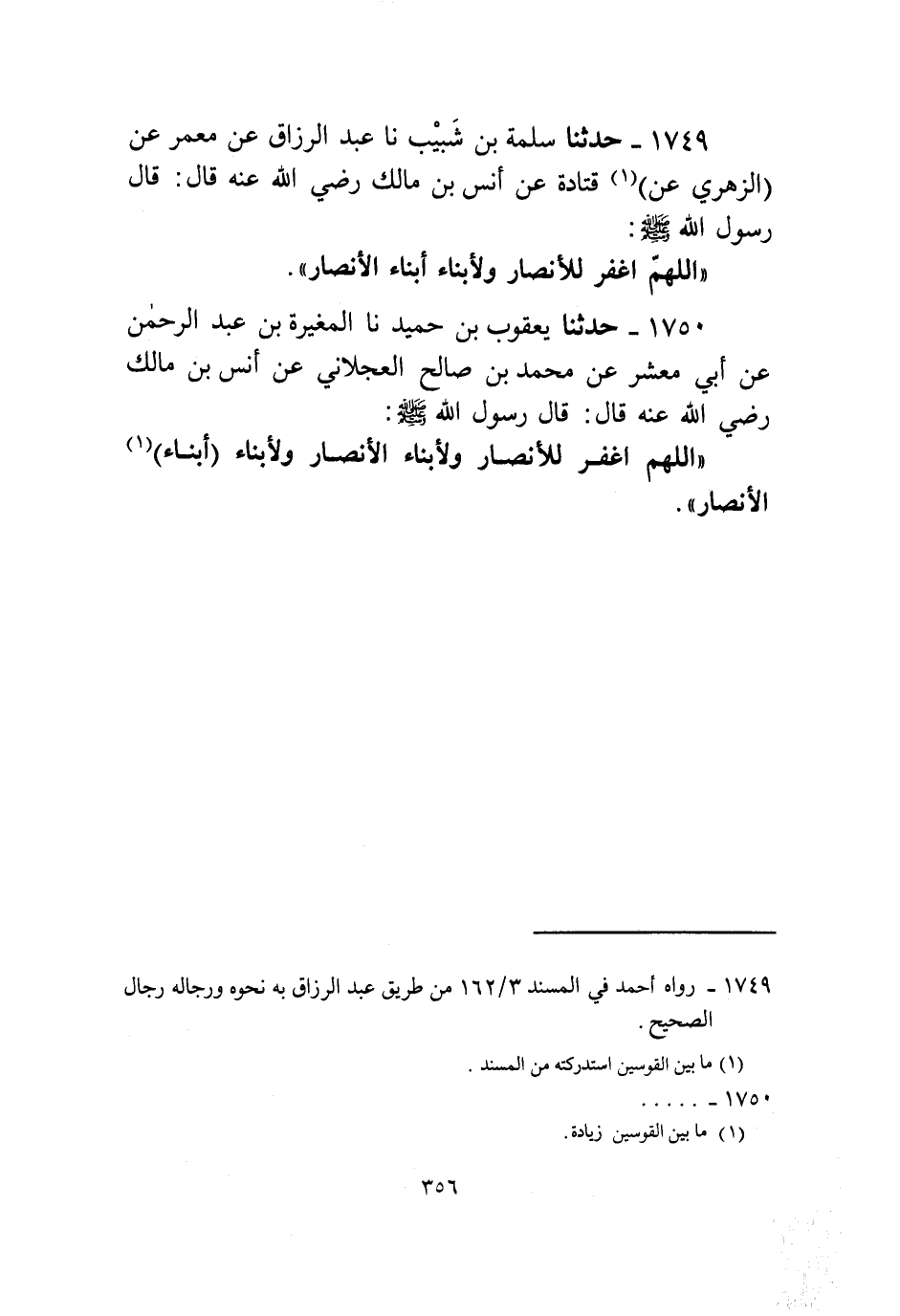 1749 - حَدَّثَنَا سَلَمَةُ بْنُ شَبِيبٍ، نا عَبْدُ الرَّزَّاقِ، عَنْ مَعْمَرٍ، عَنِ الزُّهْرِيِّ، عَنْ قَتَادَةَ، عَنْ أَنَسِ بْنِ مَالِكٍ، رَضِيَ اللَّهُ عَنْهُ قَالَ: قَالَ رَسُولُ اللَّهِ صَلَّى اللهُ عَلَيْهِ وَسَلَّمَ: «§اللَّهُمَّ اغْفِرْ لِلْأَنْصَارِ وَلِأَبْنَاءِ أَبْنَاءِ الْأَنْصَارِ»