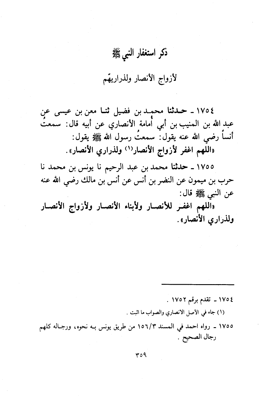 1755 - حَدَّثَنَا مُحَمَّدُ بْنُ عَبْدِ الرَّحِيمِ، نا يُونُسُ بْنُ مُحَمَّدٍ، نا حَرْبُ بْنُ مَيْمُونٍ، عَنِ النَّضْرِ بْنِ أَنَسٍ، عَنْ أَنَسِ بْنِ مَالِكٍ رَضِيَ اللَّهُ عَنْهُ، عَنِ النَّبِيِّ صَلَّى اللهُ عَلَيْهِ وَسَلَّمَ قَالَ: «§اللَّهُمَّ اغْفِرْ لِلْأَنْصَارِ وَلِأَبْنَاءِ الْأَنْصَارِ وَلِأَزْوَاجِ الْأَنْصَارِ وَلِذَرَارِيِّ الْأَنْصَارِ»