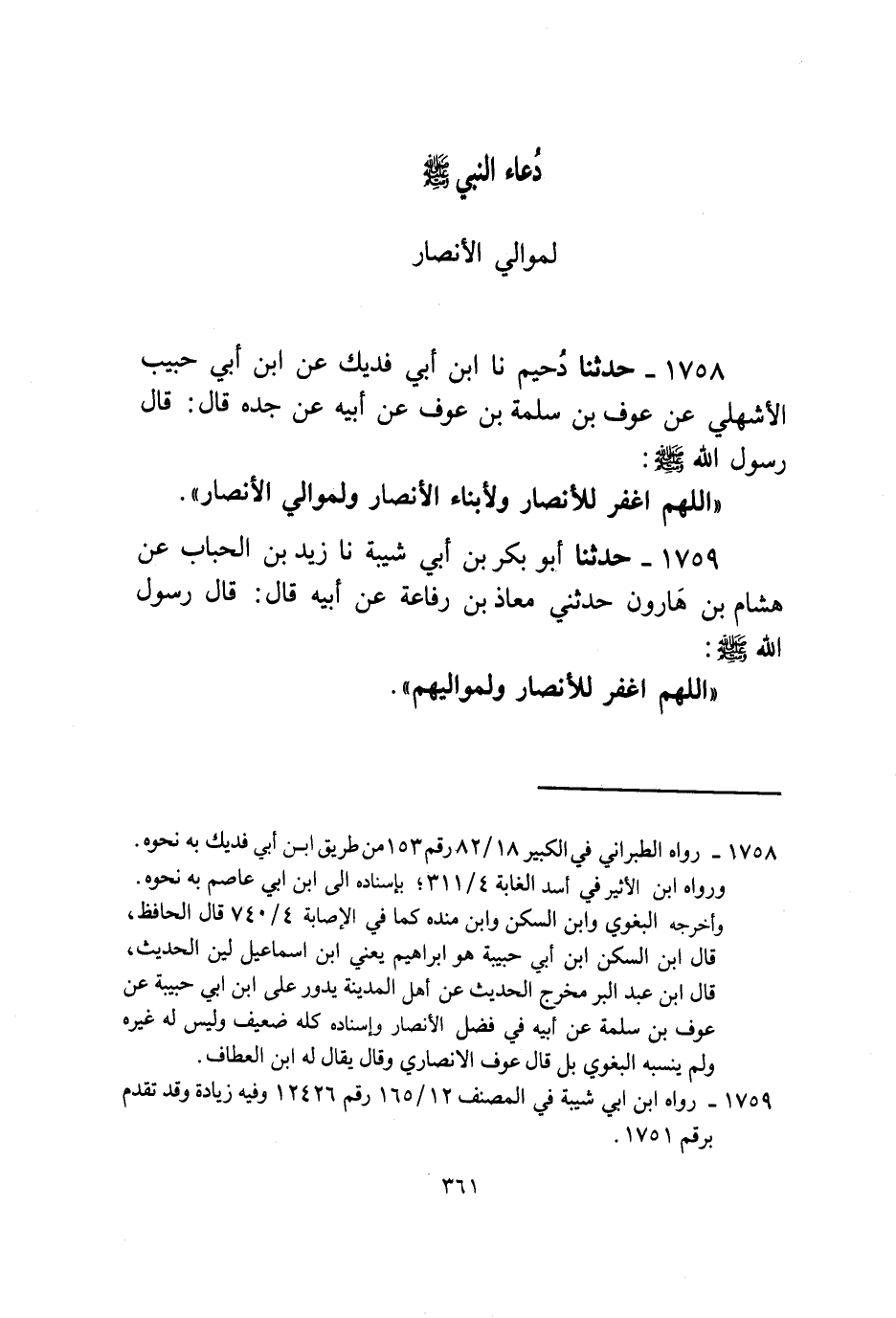 1759 - حَدَّثَنَا أَبُو بَكْرِ بْنُ أَبِي شَيْبَةَ، نا زَيْدُ بْنُ الْحُبَابِ، عَنْ هِشَامِ بْنِ هَارُونَ، حَدَّثَنِي مُعَاذُ بْنُ رِفَاعَةَ، عَنْ أَبِيهِ قَالَ: قَالَ رَسُولُ اللَّهِ صَلَّى اللهُ عَلَيْهِ وَسَلَّمَ: «§اللَّهُمَّ اغْفِرْ لِلْأَنْصَارِ وَلِمَوَالِيهِمْ»