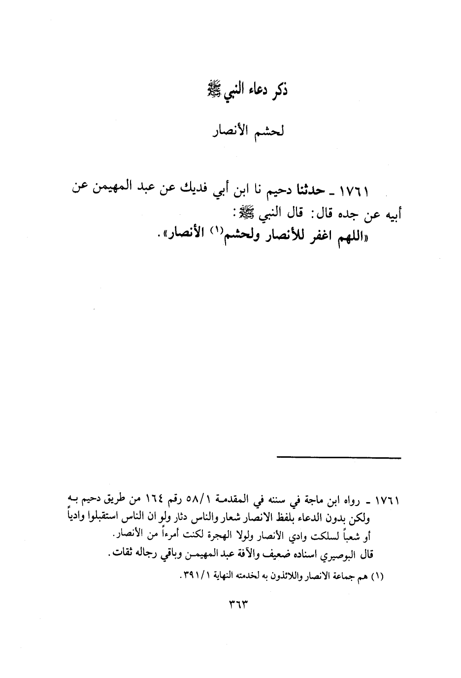 1761 - حَدَّثَنَا دُحَيْمٌ، نا ابْنُ أَبِي فُدَيْكٍ، عَنْ عَبْدِ الْمُهَيْمِنِ، عَنْ أَبِيهِ، عَنْ جَدِّهِ قَالَ: قَالَ النَّبِيُّ صَلَّى اللهُ عَلَيْهِ وَسَلَّمَ: «§اللَّهُمَّ اغْفِرْ لِلْأَنْصَارِ وَلِحَشَمِ الْأَنْصَارِ»