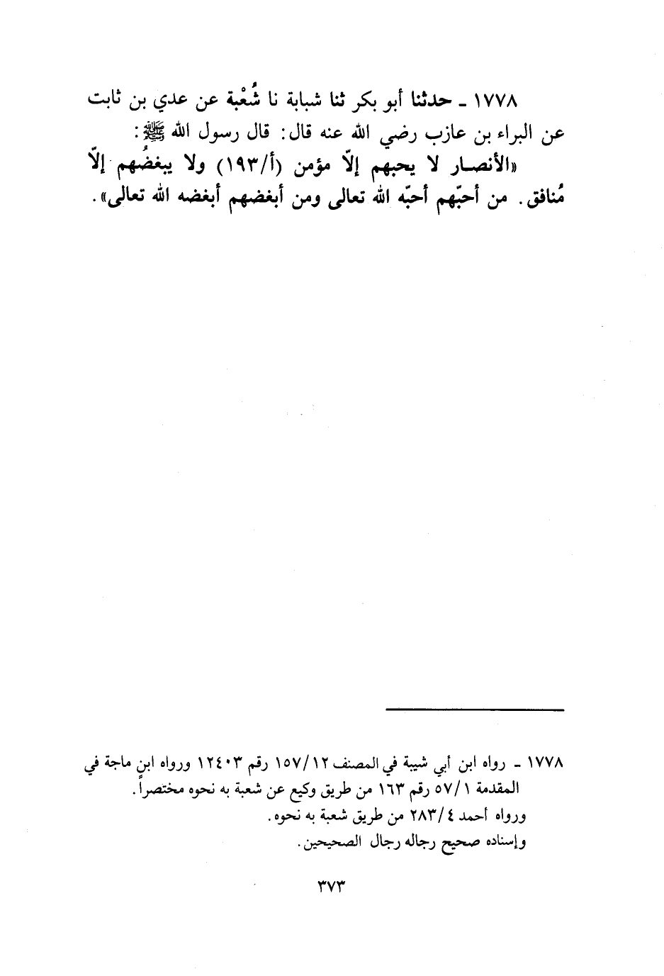 1778 - حَدَّثَنَا أَبُو بَكْرٍ، ثنا شَبَابَةُ، نا شُعْبَةُ، عَنْ عَدِيِّ بْنِ ثَابِتٍ، عَنِ الْبَرَاءِ بْنِ عَازِبٍ، رَضِيَ اللَّهُ عَنْهُ قَالَ: قَالَ رَسُولُ اللَّهِ صَلَّى اللهُ عَلَيْهِ وَسَلَّمَ: «§الْأَنْصَارُ لَا يُحِبُّهُمْ إِلَّا مُؤْمِنٌ وَلَا يُبْغِضُهُمْ إِلَّا مُنَافِقٌ، مَنْ أَحَبَّهُمْ أَحَبَّهُ اللَّهُ تَعَالَى وَمَنْ أَبْغَضَهُمْ أَبْغَضَهُ اللَّهُ تَعَالَى»