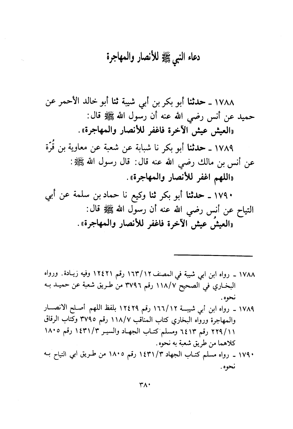 1790 - حَدَّثَنَا أَبُو بَكْرٍ، ثنا وَكِيعٌ، نا حَمَّادُ بْنُ سَلِمَةَ، عَنْ أَبِي التَّيَّاحِ، عَنْ أَنَسٍ رَضِيَ اللَّهُ عَنْهُ، أَنَّ رَسُولَ اللَّهِ صَلَّى اللهُ عَلَيْهِ وَسَلَّمَ قَالَ: «§الْعَيْشُ عَيْشُ الْآخِرَةِ فَاغْفِرْ لِلْأَنْصَارِ وَالْمُهَاجِرَةِ»