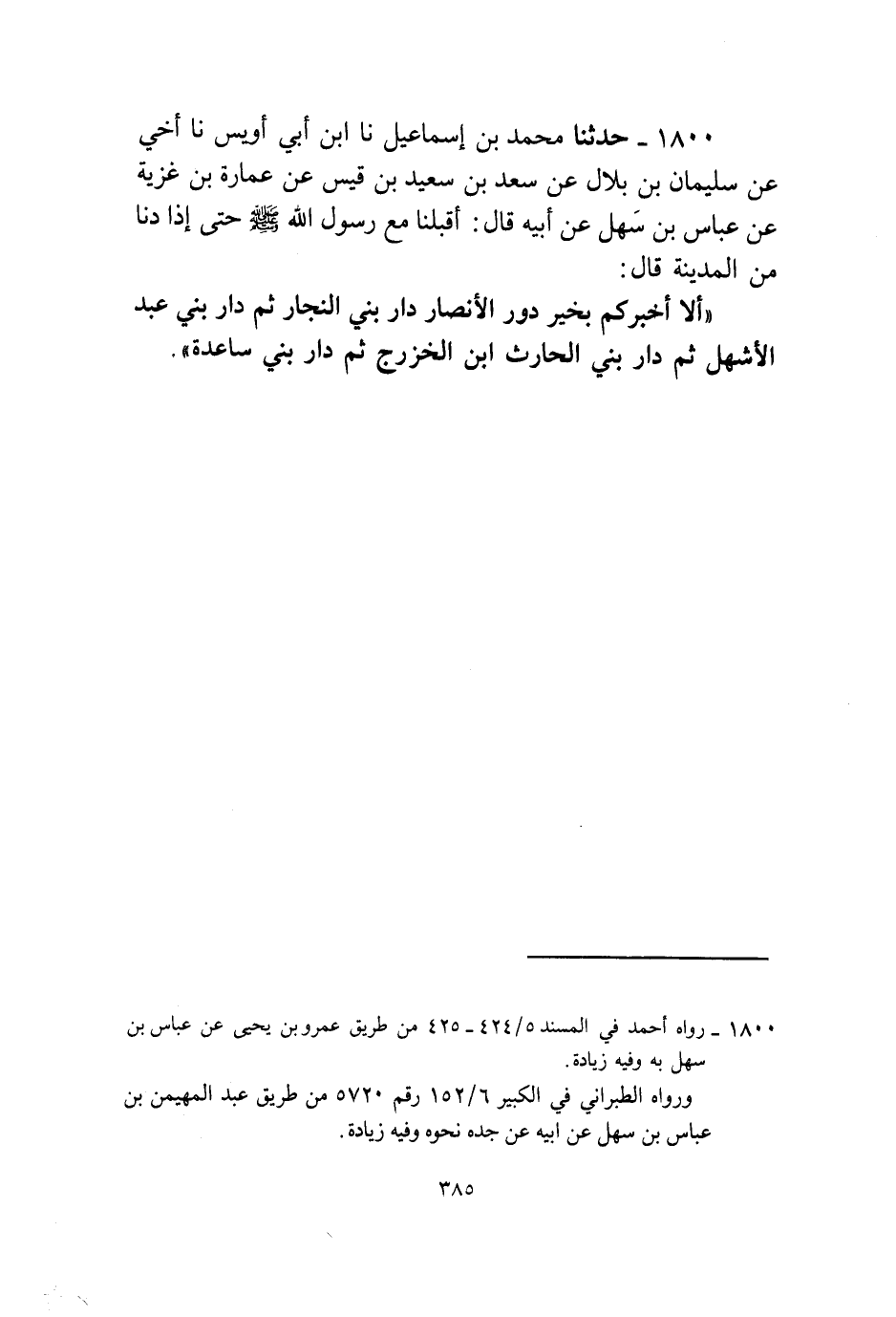 1800 - حَدَّثَنَا مُحَمَّدُ بْنُ إِسْمَاعِيلَ، نا ابْنُ أَبِي أُوَيْسٍ، نا أَخِي، عَنْ سُلَيْمَانَ بْنِ بِلَالٍ، عَنْ سَعْدِ بْنِ سَعِيدِ بْنِ قَيْسٍ، عَنْ عُمَارَةَ بْنِ غَزِيَّةَ، عَنْ عَبَّاسِ بْنِ سَهْلٍ، عَنْ أَبِيهِ قَالَ: أَقْبَلْنَا مَعَ رَسُولِ اللَّهِ صَلَّى اللهُ عَلَيْهِ وَسَلَّمَ حَتَّى إِذَا دَنَا مِنَ الْمَدِينَةِ قَالَ: «§أَلَا أُخْبِرُكُمْ بِخَيْرِ دُورِ الْأَنْصَارِ؟ دَارُ بَنِي النَّجَّارِ ثُمَّ دَارُ بَنِي عَبْدِ الْأَشْهَلِ، ثُمَّ دَارُ بَنِي الْحَارِثِ بْنِ الْخَزْرَجِ ثُمَّ دَارُ بَنِي سَاعِدَةَ»