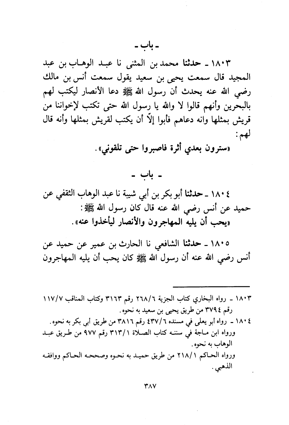 1803 - حَدَّثَنَا مُحَمَّدُ بْنُ الْمُثَنَّى، نا عَبْدُ الْوَهَّابِ بْنُ عَبْدِ الْمَجِيدِ قَالَ: سَمِعْتُ يَحْيَى بْنَ سَعِيدٍ يَقُولُ: سَمِعْتُ أَنَسَ بْنَ مَالِكٍ رَضِيَ اللَّهُ عَنْهُ يُحَدِّثُ، أَنَّ رَسُولَ اللَّهِ صَلَّى اللهُ عَلَيْهِ وَسَلَّمَ " §دَعَا الْأَنْصَارَ لِيَكْتُبَ لَهُمْ بِالْبَحْرَيْنِ وَأَنَّهُمْ قَالُوا: لَا وَاللَّهِ يَا رَسُولَ اللَّهِ، حَتَّى تَكْتُبَ لِإِخْوَانِنَا مِنْ قُرَيْشٍ بِمِثْلِهَا. وَأَنَّهُ دَعَاهُمْ فَأَبَوْا إِلَّا أَنْ يَكْتُبَ لِقُرَيْشٍ بِمِثْلِهَا، وَأَنَّهُ قَالَ لَهُمْ: «سَتَرَوْنَ بَعْدِي أَثَرَةً فَاصْبِرُوا حَتَّى تَلْقَوْنِي»