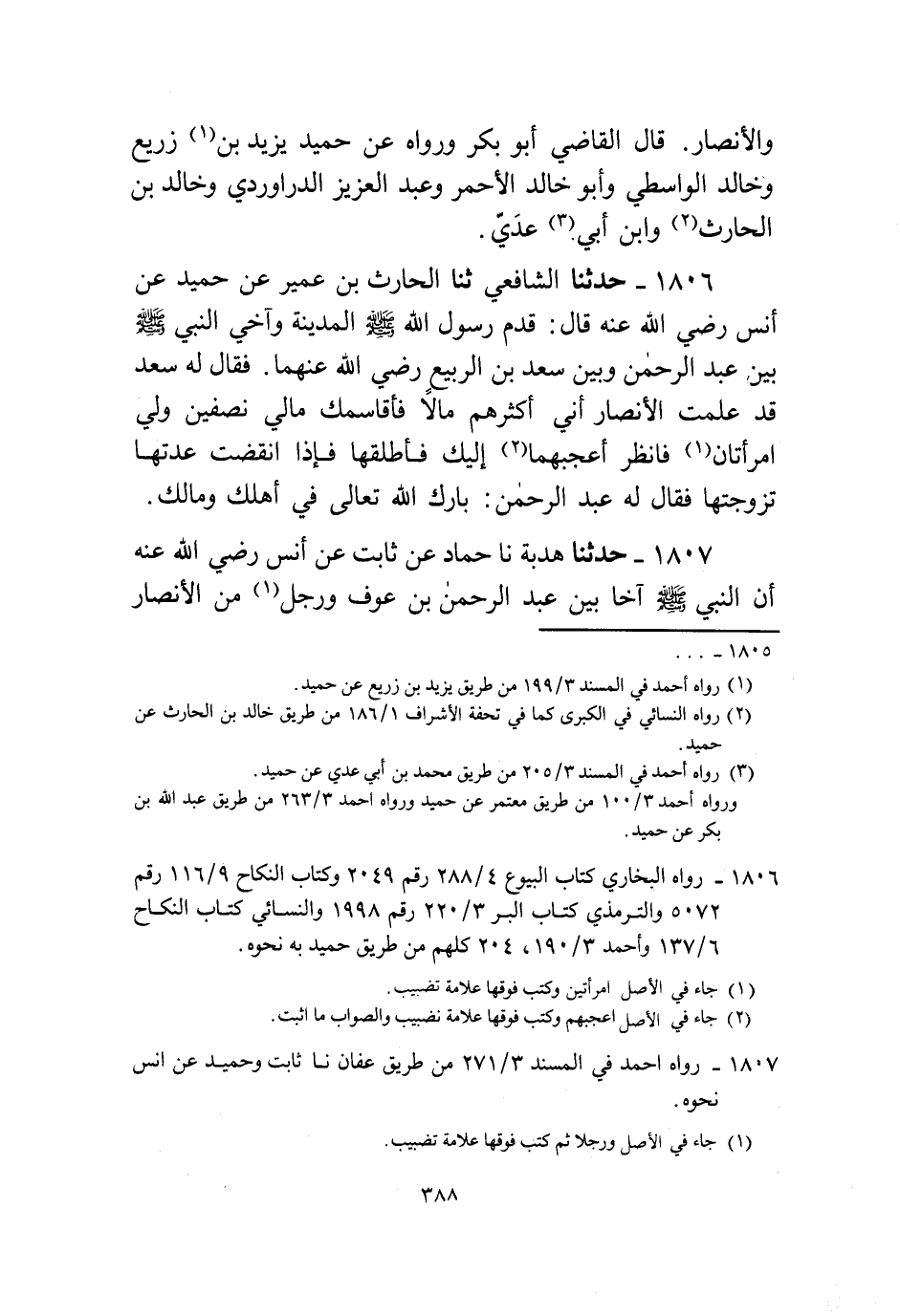 1806 - حَدَّثَنَا الشَّافِعِيُّ، ثنا الْحَارِثُ بْنُ عُمَيْرٍ، عَنْ حُمَيْدٍ، عَنْ أَنَسٍ، رَضِيَ اللَّهُ عَنْهُ قَالَ: قَدِمَ رَسُولُ اللَّهِ صَلَّى اللهُ عَلَيْهِ وَسَلَّمَ الْمَدِينَةَ " §وَآخَى النَّبِيُّ صَلَّى اللهُ عَلَيْهِ وَسَلَّمَ بَيْنَ عَبْدِ الرَّحْمَنِ وَبَيْنَ سَعْدِ بْنِ الرَّبِيعِ رَضِيَ اللَّهُ عَنْهُمَا فَقَالَ لَهُ سَعْدٌ: قَدْ عَلِمَتِ الْأَنْصَارُ أَنِّي أَكْثَرُهُمْ مَالًا فَأُقَاسِمُكَ مَالِي نِصْفَيْنِ وَلِي امْرَأَتَانِ فَانْظُرْ أَعْجَبَهُمَا إِلَيْكَ فَأُطَلِّقُهَا فَإِذَا انْقَضَتْ عِدَّتُهَا تَزَوَّجْتَهَا. فَقَالَ لَهُ عَبْدُ الرَّحْمَنِ بَارَكَ اللَّهُ تَعَالَى فِي أَهْلِكَ وَمَالِكَ "