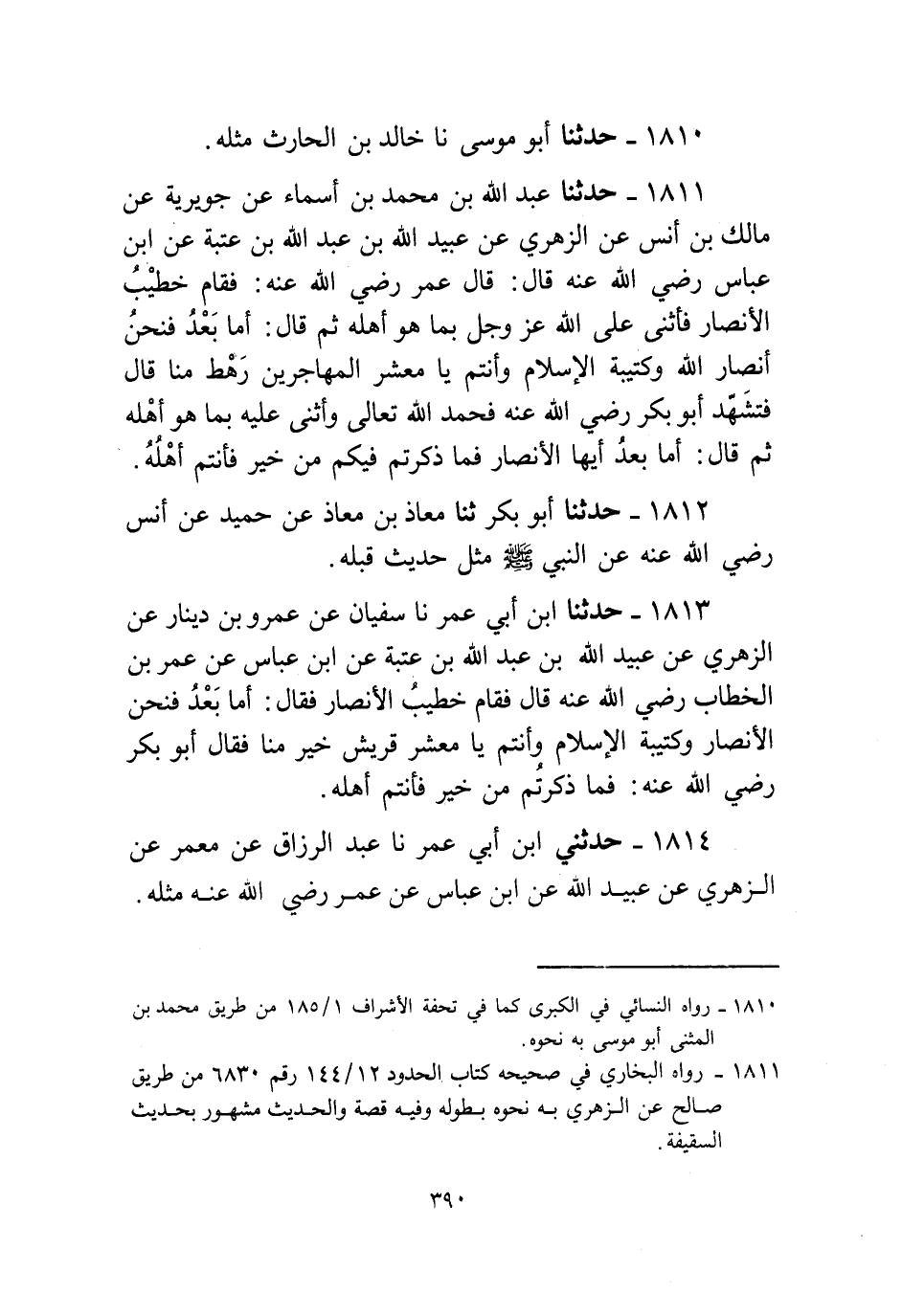 1811 - حَدَّثَنَا عَبْدُ اللَّهِ بْنُ مُحَمَّدِ بْنِ أَسْمَاءَ، عَنْ جُوَيْرِيَةَ، عَنْ مَالِكِ بْنِ أَنَسٍ، عَنِ الزُّهْرِيِّ، عَنْ عُبَيْدِ اللَّهِ بْنِ عَبْدِ اللَّهِ بْنِ عُتْبَةَ، عَنِ ابْنِ عَبَّاسٍ، رَضِيَ اللَّهُ عَنْهُ قَالَ: قَالَ عُمَرُ رَضِيَ اللَّهُ عَنْهُ فَقَامَ خَطِيبُ الْأَنْصَارِ فَأَثْنَى عَلَى اللَّهِ عَزَّ وَجَلَّ بِمَا هُوَ أَهْلُهُ ثُمَّ قَالَ: «§أَمَّا بَعْدُ. فَنَحْنُ أَنْصَارُ اللَّهِ وَكَتِيبَةُ الْإِسْلَامِ، وَأَنْتُمْ يَا مَعْشَرَ الْمُهَاجِرِينَ رَهْطٌ مِنَّا» . قَالَ: فَتَشَهَّدَ أَبُو بَكْرٍ رَضِيَ اللَّهُ عَنْهُ فَحَمِدَ اللَّهَ تَعَالَى وَأَثْنَى عَلَيْهِ بِمَا هُوَ أَهْلُهُ ثُمَّ قَالَ: «أَمَّا بَعْدُ. أَيُّهَا الْأَنْصَارُ فَمَا ذَكَرْتُمْ فِيكُمْ مِنْ خَيْرٍ فَأَنْتُمْ أَهْلُهُ»