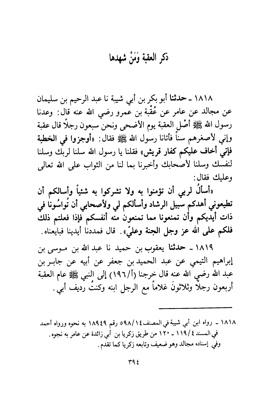 1818 - حَدَّثَنَا أَبُو بَكْرِ بْنُ أَبِي شَيْبَةَ، نا عَبْدُ الرَّحِيمِ بْنُ سُلَيْمَانَ، عَنْ مُجَالِدٍ، عَنْ عَامِرٍ، عَنْ عُقْبَةَ بْنِ عَمْرٍو، رَضِيَ اللَّهُ عَنْهُ قَالَ: وَعَدَنَا رَسُولُ اللَّهِ صَلَّى اللهُ عَلَيْهِ وَسَلَّمَ أَصْلَ الْعَقَبَةِ يَوْمَ الْأَضْحَى وَنَحْنُ سَبْعُونَ رَجُلًا قَالَ عُقْبَةُ: وَإِنِّي لَأَصْغَرُهُمْ سِنًّا، فَأَتَانَا رَسُولُ اللَّهِ صَلَّى اللهُ عَلَيْهِ وَسَلَّمَ فَقَالَ: «أَوْجِزُوا فِي الْخُطْبَةِ؛ فَإِنِّي أَخَافُ عَلَيْكُمْ كُفَّارَ قُرَيْشٍ» . فَقُلْنَا: " §يَا رَسُولَ اللَّهِ، سَلْنَا لِرَبِّكَ وَسَلْنَا لِنَفْسِكَ وَسَلْنَا لِأَصْحَابِكَ وَأَخْبِرْنَا بِمَا لَنَا مِنَ الثَّوَابِ عَلَى اللَّهِ تَعَالَى وَعَلَيْكَ. فَقَالَ: «أَسْأَلُ لِرَبِّي أَنْ تُؤْمِنُوا بِهِ وَلَا تُشْرِكُوا بِهِ شَيْئًا وَأَسْأَلُكُمْ أَنْ تُطِيعُونِي أَهْدِكُمْ سَبِيلَ الرَّشَادِ، وَأَسْأَلُكُمْ لِي وَلِأَصْحَابِي أَنْ تُوَاسُونَا فِي ذَاتِ أَيْدِيكُمْ، وَأَنْ تَمْنَعُونَا مِمَّا تَمْنَعُونَ مِنْهُ أَنْفُسَكُمْ، فَإِذَا فَعَلْتُمْ ذَلِكَ فَلَكُمْ عَلَى اللَّهِ عَزَّ وَجَلَّ الْجَنَّةُ وَعَلِيَّ» قَالَ: فَمَدَدْنَا أَيْدِيَنَا فَبَايَعْنَاهُ