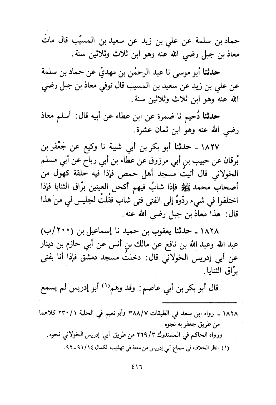 1828 - حَدَّثَنَا يَعْقُوبُ بْنُ حُمَيْدٍ، نا إِسْمَاعِيلُ بْنُ عَبْدِ اللَّهِ، وَعَبْدُ اللَّهِ بْنُ نَافِعٍ، عَنْ مَالِكِ بْنِ أَنَسٍ، عَنْ أَبِي حَازِمِ بْنِ دِينَارٍ، عَنْ أَبِي إِدْرِيسَ الْخَوْلَانِيِّ قَالَ: «§دَخَلْتُ مَسْجِدَ دِمَشْقَ فَإِذَا أَنَا بِفَتًى بَرَّاقِ الثَّنَايَا» قَالَ أَبُو بَكْرِ بْنُ أَبِي عَاصِمٍ: وَقَدْ وَهِمَ أَبُو إِدْرِيسَ لَمْ يَسْمَعْ مِنْ مُعَاذٍ وَلَا رَآهُ قَالَ الزُّهْرِيُّ، حَدَّثَنِي أَبُو إِدْرِيسَ قَالَ: فَاتَنِي مُعَاذٌ لَمْ أَلْقَهُ فَحَدَّثَنِي يَزِيدُ بْنُ عُمَيْرَةَ عَنْهُ "