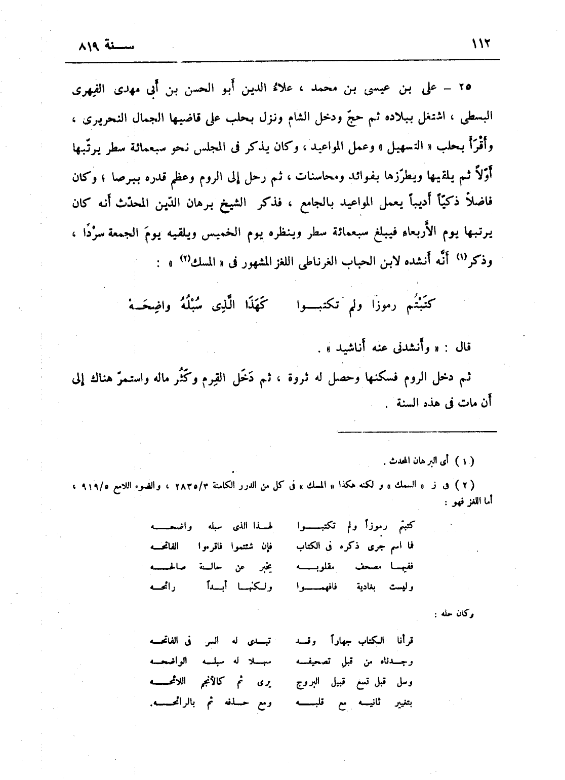علي بن عيسى بن محمد، علاء الدين أبو الحسن بن أبي مهدي، الفهري البسطي، اشتغل ببلاده ثم حج ودخل الشام ونزل بحلب على قاضيها الجمال النحريري، وقرأ بحلب التسهيل وعمل المواعيد بالجامع - وكان يذكر في المجلس نحو سبعمائة سطر يرتبها أولاً ثم يلقيها ويطرزها بفوائد ومناسبات، ثم رحل إلى الروم وعظم قدره ببرصا، وكان فاضلاً ذكياً أديباً يعمل المواعيد بالجامع فذكر لي - الشيخ برهان الدين المحدث أنه كان يرتبه يوم الأربعاء فيبلغ سبعمائة سطر وينظره يوم الخميس ويلقيه يوم الجمعة سرداً، وذكر لي - أنه أنشده لابن الحباب الغرناطي اللغز المشهور في السمك.