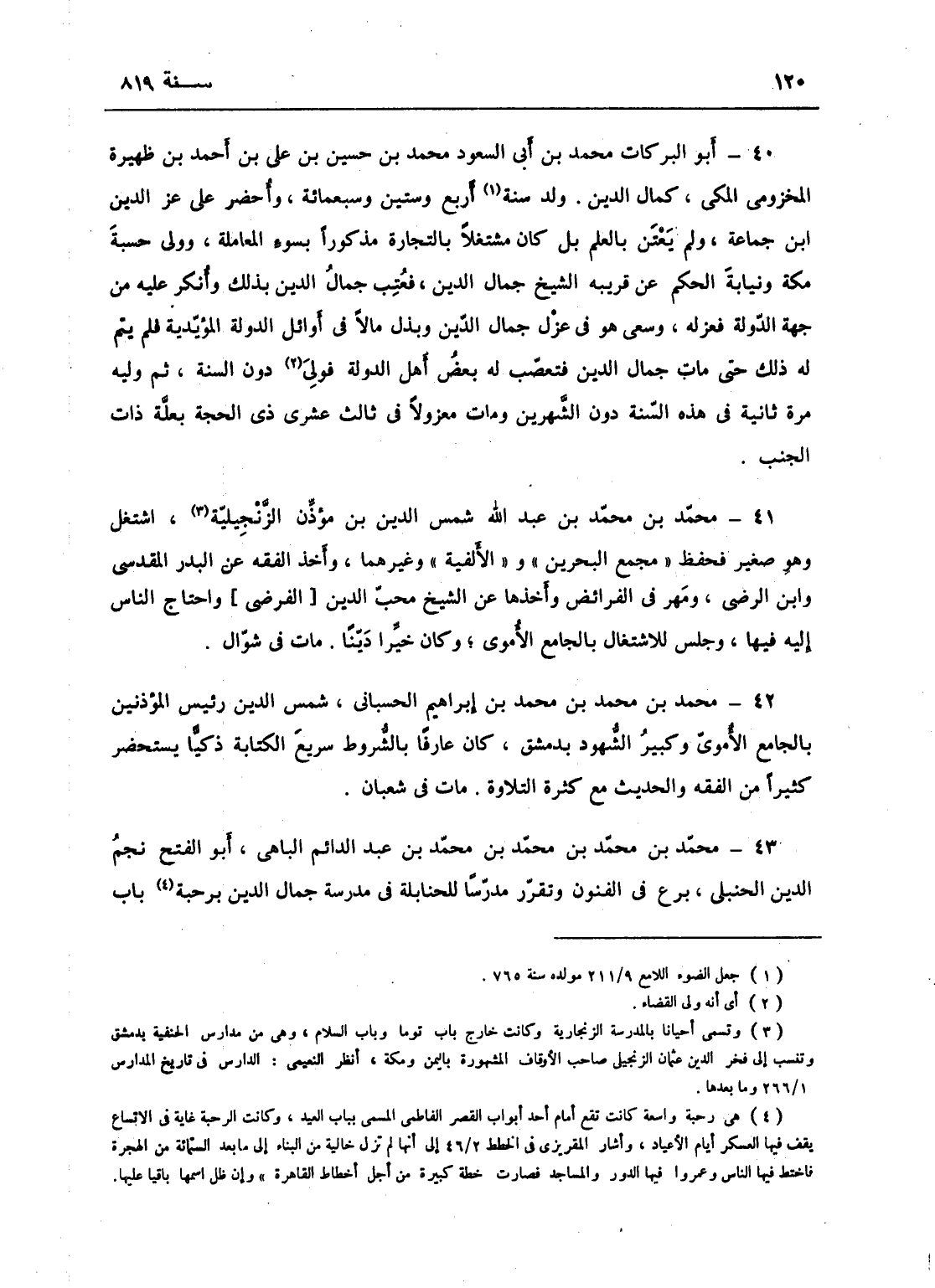 أبو البركات محمد بن أبي السعود محمد بن حسين بن علي بن أحمد بن ظهيرة، المخزومي المكي كمال الدين، ولد سنة أربع وستين وسبعمائة، وأحضر على عز الدين بن جماعة ولم يعتن بالعلم بل كان مشتغلاً بالتجارة مذكوراً بسوء المعاملة، وولي حسبة مكة ونيابة الحكم عن قريبه الشيخ جمال الدين، فعيب جمال الدين بذلك، وأنكر عليه من جهة الدولة فعزله، فسعى هو في عزل جمال الدين وبذل مالاً في أوائل الدولة المؤيدية فلم يتم له ذلك حتى مات جمال الدين، فتعصب له بعض أهل الدولة فولي دون السنة ثم ولي مرة ثانية في هذا السنة دون الشهرين، ومات معزولاً في ثالث عشري ذي الحجة بعلة ذات الجنب.