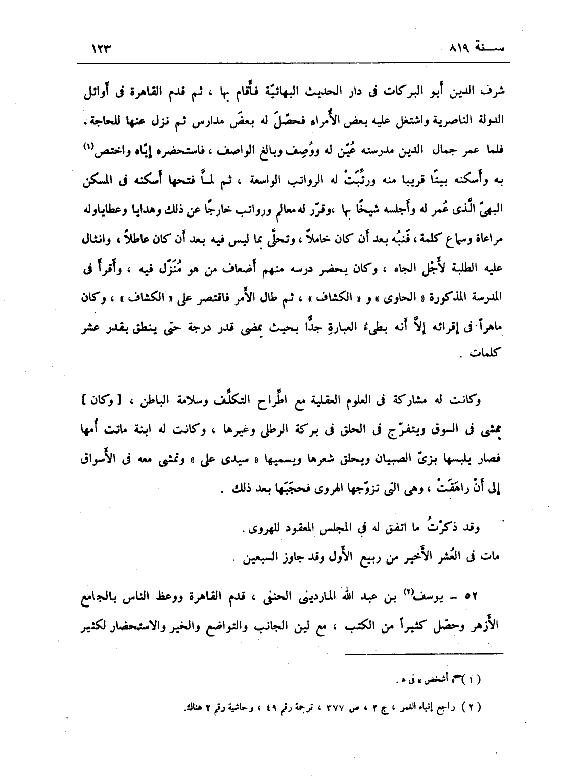 شرف الدين أبو البركات في دار الحديث البهائية، فأقام بها، ثم قدم القاهرة في أوائل الدولة الناصرية، واشتمل عليه بعض الأمراء فحصل له بعض المدارس، ثم نزل عنها للحاجة، فلما عمر جمال الدين مدرسته عين له، ووصف وبالغ في الوصف فاستحضره وأشخص به وأسكنه بيتاً قريباً منه ورتب له الرواتب الواسعة، ثم لما فتحها أسكنه في المسكن البهي الذي عمر له وأجلسه شيخا بها وقرر له معاليم ورواتب خارجاً عن ذلك وهدايا وعطايا ومراعاة وسماع كلمة فنبه بعد أن كان خاملاً، وتحلى بما ليس فيه بعد أن كان عاطلاً وانثال عليه الطلبة لأجل الجاه، فكان يحضر درسه منهم أضعاف من هو منزل فيه، وأقرأ في المدرسة المذكورة الحاوي والكشاف، ثم طال الأمر فاقتصر على الكشاف وكان ماهراً في إقرائه إلا أنه بطيء العبارة جداً بحيث يمضي قدر درجة حتى ينطق بقدر عشر كلمات، وكانت له مشاركة في العلوم العقلية مع إطراح التكلف وسلامة الباطن، يمشي في السوق ويتفرج في الحلق في بركة الرطلي وغيرها، وكانت له ابنة ماتت أمها فصار يلبسها بزي الصبيان ويحلق شعرها ويسميها سيدي علي. وتمشي معه في الأسواق إلى أن راهقت، وهي التي تزوجها الهروي فحجبها بعد ذلك، وقد ذكرت ما اتفق له في المجلس المعقود للهروي مات في العشر الأخير من ربيع الأول وقد جاوز السبعين.