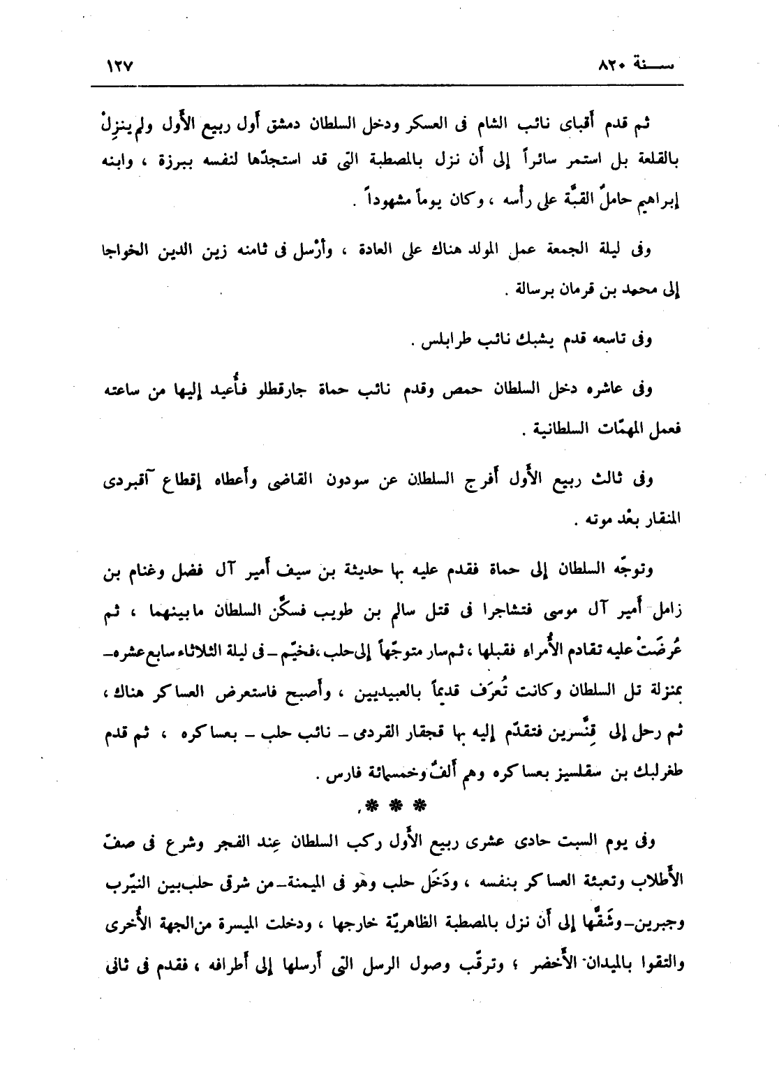 وفي عاشره دخل السلطان حمص وقدم نائب حماة جارقطلو فأعيد إليها من ساعته لعمل المهمات السلطانية.