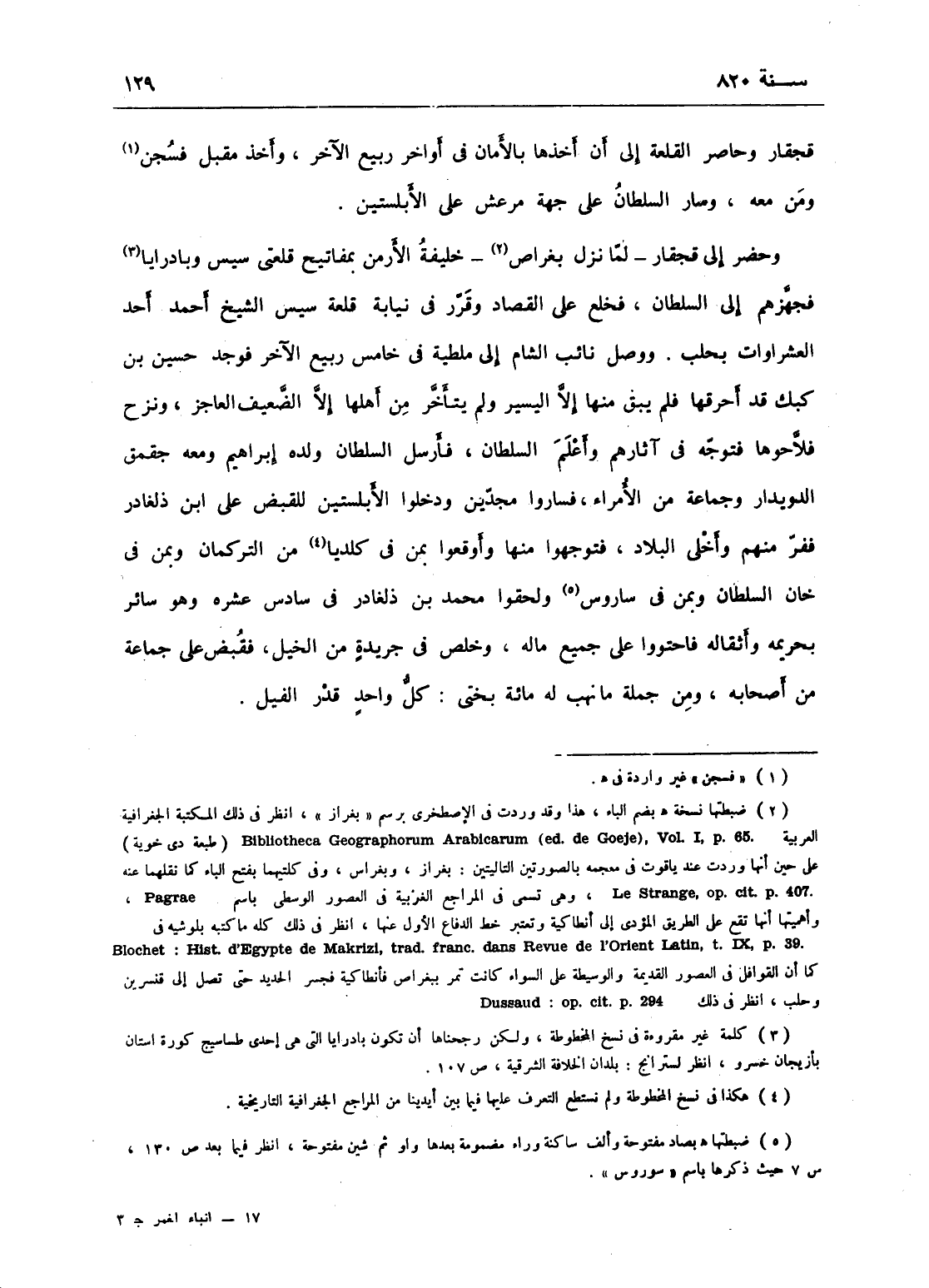 وأخذ مقبل ومن معه وسجنوا - وسار السلطان على جهة مرعش على الأبلستين وحضر إلى قجقار لما نزل بغراص خليفة الأرمن بمفاتيح قلعتي سيس وبادوز، فجهزهم السلطان فخلع علي القصاد.