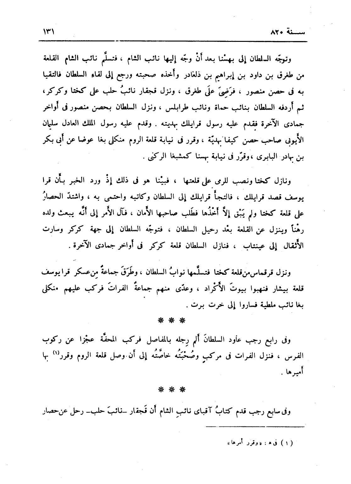 وتوجه السلطان إلى بهنسا بعد أن وجه إليها نائب الشام، فتسلم نائب الشام القلعة من طغرق بن داود بن إبراهيم بن دلغادر وأخذه صحبته ورجع إلى لقاء السلطان، فالتقيا به عند حصن منصور فرضي على طغرق، ونزل قجقار نائب حلب على كختا وكركر، ثم أردفه السلطان بنائب حماة ونائب طرابلس ونزل السلطان بحصن منصور في أواخر جمادى الآخرة، فقدم عليه رسول قرا يلك بهدية، وقدم عليه رسول الملك العادل سليمان الأيوبي صاحب حصن كيفا بهديته، وقرر في نيابة قلعة الروم منكلي بغا عوضاً عن أبي بكر بن بهادر الياسري وقرر في نيابة بهنسا كمشبغا الركني، ونازل كختا ونصب للرمي على قلعتها مدفعا - فبينا هو كذلك إذ ورد الخبر بأن قرا يوسف قصد قرا يلك، فالتجأ قرا يلك إلى السلطان وكاتبه واحتمى به واشتد الحصار على قلعة كختا ولم يبق إلا أخذها فطلب صاحبها الأمان، فآل الأمر إلى أنه يبعث ولده لهنا وينزل عن القلعة بعد رحيل السلطان، فتوجه السلطان إلى جهة كرر وسارت الأثقال إلى عينتاب فنازل السلطان قلعة كركر في أوائل جمادى الآخرة ونزل قرقماش من قلعة كختا فتسلمها نواب السلطان، وطرق جماعة من عسكر قرا يوسف قلعة تناسر فنهبوا بيوت الأكراد، وعدا منهم جماعة الفرات فركب عليهم بغا نائب ملطية فساروا إلى خرت برت، وقرر السلطان شاهين الحاجب في نيابة كركر وكزل بغا في نيابة كختا.