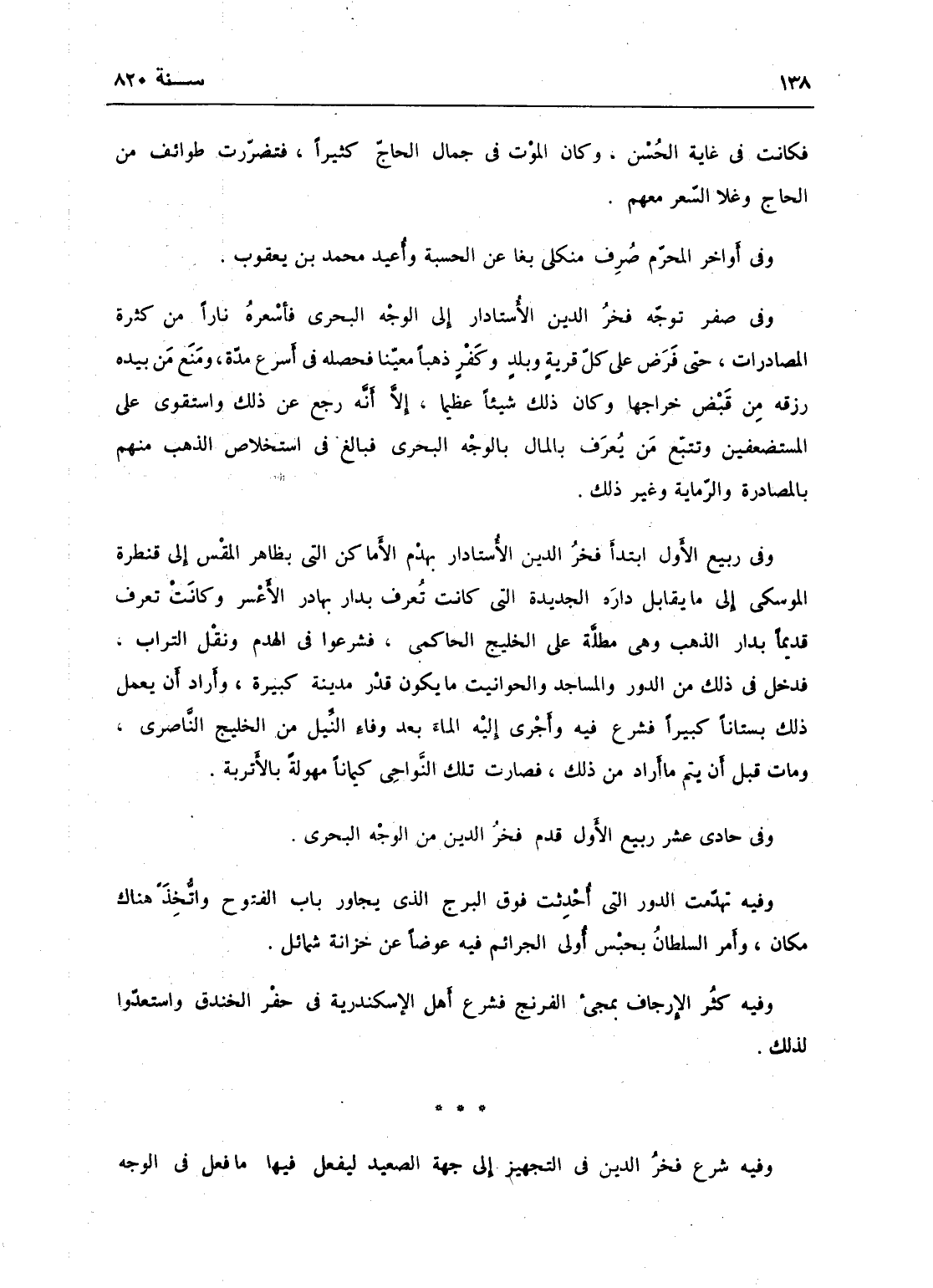 وفي صفر توجه فخر الدين الأستادار إلى الوجه البحري فأسعره ناراً من كثرة المصادرات حتى فرض على كل قرية وكفر وبلد ذهباً معيناً فحصله في أسرع مدة ومنع من بيده رزقه من قبض خراجها. وكان ذلك شيئاً عظيماً إلا أنه رجع عن ذلك. واستقوى على المستضعفين وتتبع من يعرف بالمال في الوجه البحري فبالغ في استخلاص الذهب منهم بالمصادرة والرماية وغير ذلك.