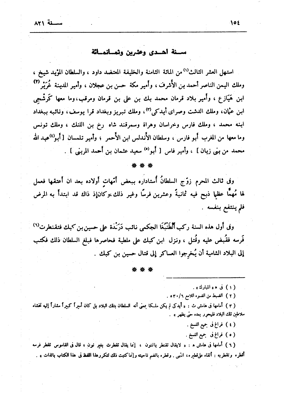 استهل العشر الثالث من المائة التاسعة والخلفية المعتضد داود، والسلطان الملك المؤيد شيخ، وملك اليمن الناصر أحمد بن الأشرف، وأمير مكة حسن بن عجلان، وأمير المدينة عزيز بن هيازع، وأمير بلاد قرمان محمد بك بن علي بك بن قرمان ومرقب وما معها كرسجى ابن عثمان، وملك الدشت وصراي أيدكي وملك تبريز وبغداد قرا يوسف، ونائبه ببغداد ابنه محمد، وملك فارس وخراسان وهراة وسمرقند شاه رخ ابن اللنك، وملك تونس وما معها من المغرب أبو فارس، وسلطان الأندلس ابن الأحمر وأمير تلمسان ... وأمير فاس..