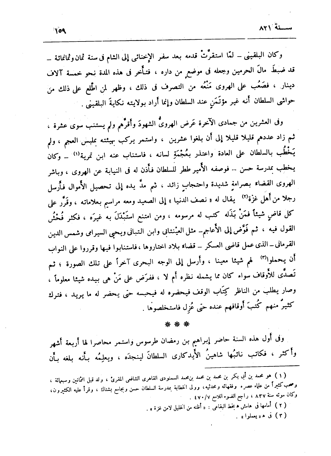 وكان البلقيني لما استقرت قدمه بعد سفر الإخناي إلى الشام في سنة ثمان وثمانمائة قد ضبط مال الحرمين وجعله في موضع من داره فتأخر في هذه المدة نحو خمسة آلاف دينار، فصعب على الهروي منعه من التصرف في ذلك، وظهر لمن اطلع على ذلك من حواشي السلطان أنه غير مؤتمن عند السلطان وإنما أراد بولايته نكاية البلقيني.