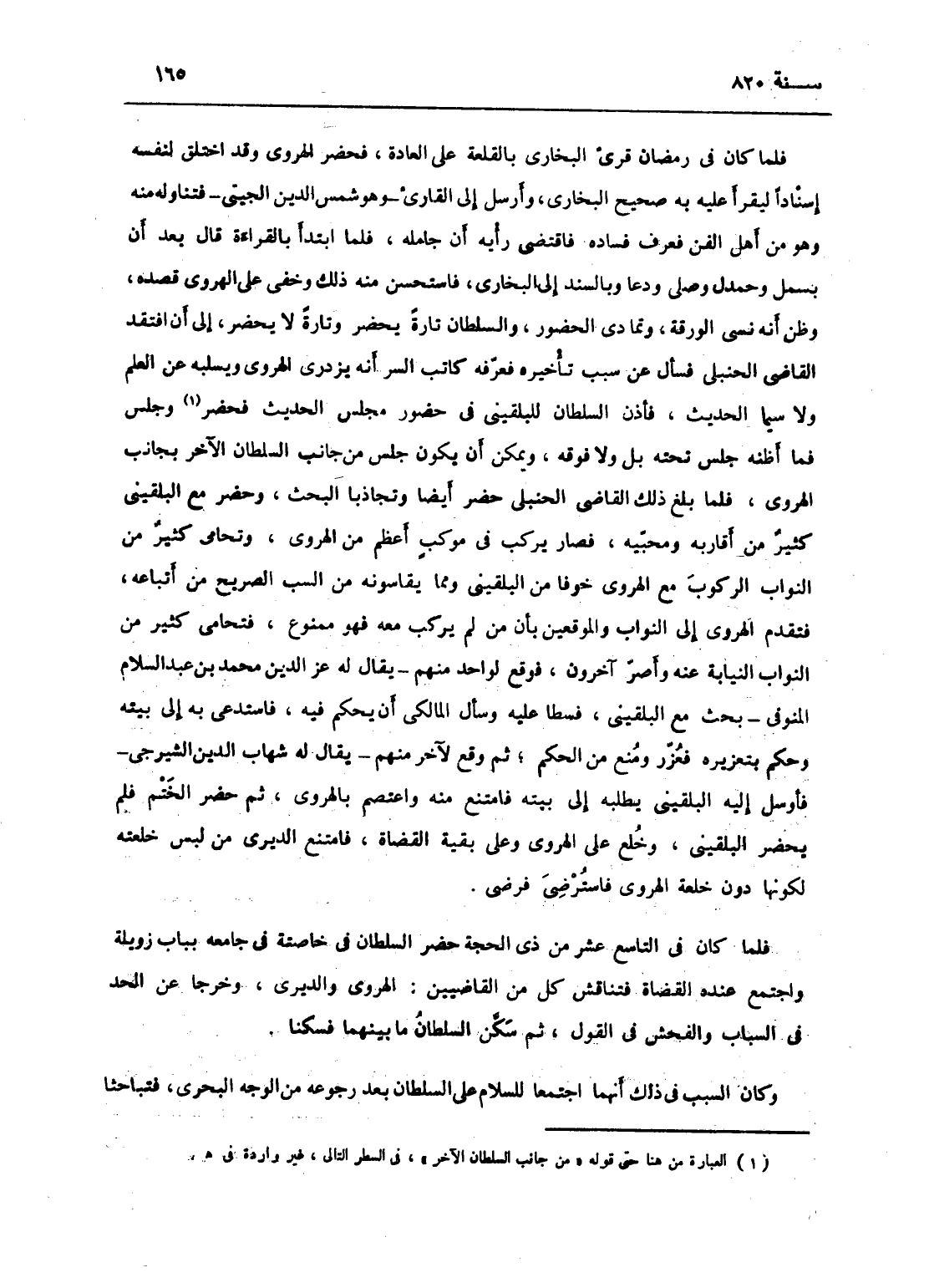 فلما كان في رمضان قرئ البخاري بالقلعة على العادة فحضر الهروي وقد اختلق لنفسه أسناداً ليقرأ عليه به صحيح البخاري وأرسل إلى القارئ وهو شمس الدين الجبتي فتناوله منه وهو من أهل الفن فعرف فساده فاقتضى رأيه أن جامله، فلما ابتدأ بالقراءة قال بعد أن بسمل وحمدل وصلى ودعا: وبالسند إلى البخاري، فاستحسن ذلك منه، وخفي على الهروي قصده وظن أنه نسي الورقة، وتمادى الحضور والسلطان تارة يحضر وتارة لا يحضر إلى أن افتقد القاضي الحنبلي فسأل عن سبب تأخره، فعرفه كاتب السر أنه يزدري الهروي ويسلبه عن العلم ولا سيما الحديث، فأذن السلطان للبلقيني في حضور مجلس الحديث، فحضر وجلس بجانب الهروي، فلما بلغ ذلك القاضي الحنبلي حضر أيضاً وتجاذبا البحث، وحضر مع البلقيني كثير من أقاربه ومحبيه فصار يركب في موكب أعظم من الهروي، وتحامى كثير من النواب الركوب مع الهروي خوفاً من البلقيني ومما يقاسونه من السب الصريح من أتباعه، فتقدم الهروي إلى النواب والموقعين بأن لمن لم يكب معه فهو ممنوع، فتحامى كثير من الناس النيابة عنه وأصر آخرون، فوقع لواحد منهم يقال له عز الدين محمد ابن عبد السلام المنوفي بحث مع البلقيني فسطا عليه وسأل المالكي أن يحكم فيه، فاستدعى به إلى بيته وحكم بتعزيره، فعزر ومنع عن الحكم، ثم وقع لآخر منهم يقال له شهاب الدين السيرجي فأرسل البلقيني يطلبه إلى بيته، فامتنع منه واعتصم بالهروي، ثم حضر الختم فلم يحضر البلقيني وخلع على الهروي وعلى بقية القضاة، فامتنع الديري من ليس خلعته لكونها دون خلعة الهروي، فاسترضى فرضي.