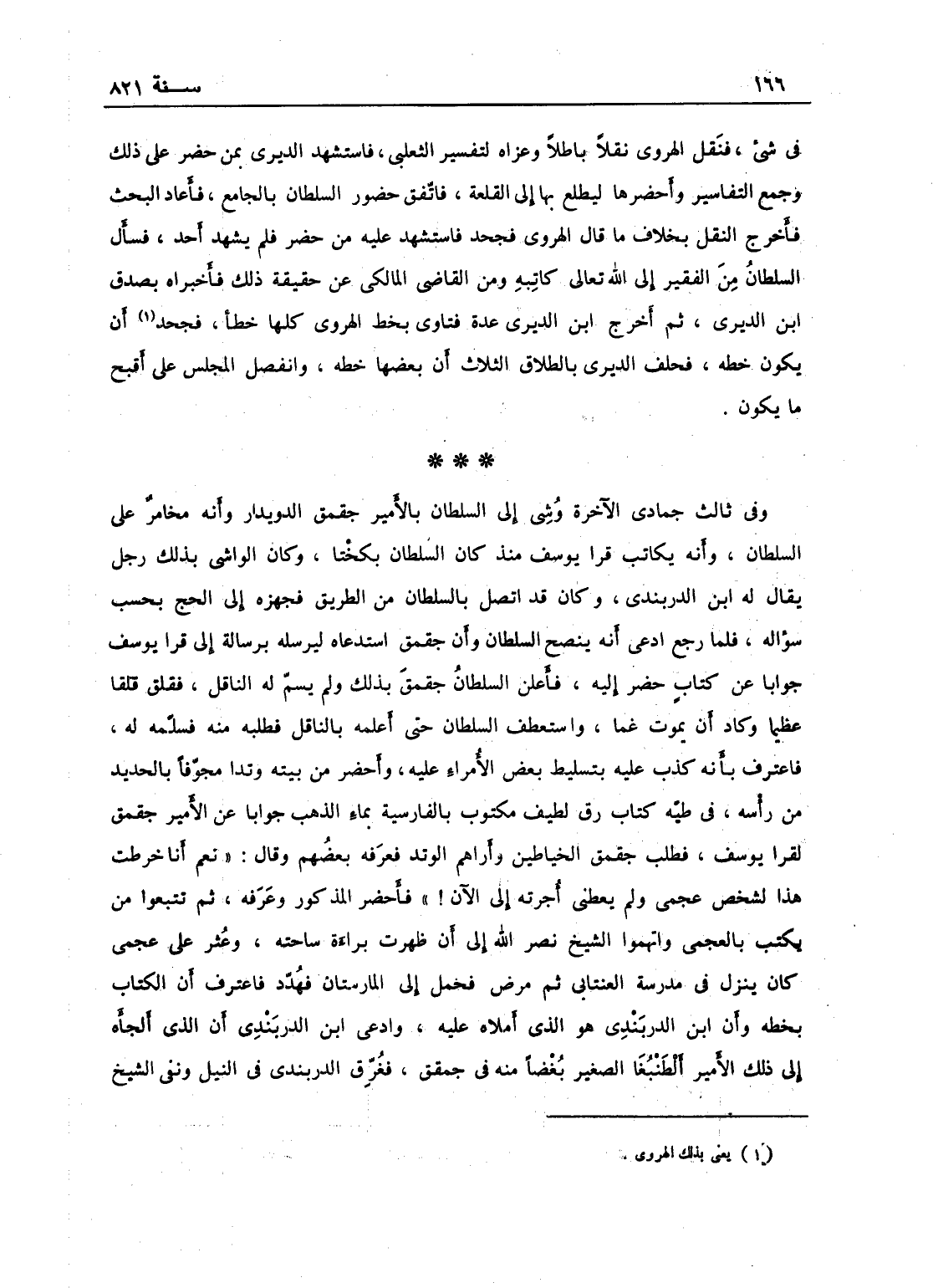في شيء. فنقل الهروي نقلاً باطلاً وعزاه لتفسير الثعلبي، فاستشهد الديري بمن حضر على ذلك وجمع التفاسير وأحضرها ليطلع بها إلى القلعة، فاتفق حضور السلطان بالجامع فأعاد البحث، فأخرج النقل بخلاف ما قال الهروي فجحد، فاستشهد عليه من حضر فلم يشهد أحد، فسأل السلطان من الفقير إلى الله تعالى كاتبه ومن القاضي المالكي عن حقيقة ذلك، فأخبراه بصدق ابن الديري، ثم أخرج ابن الديري عدة فتاوى بخط الهروي كلها خطأ، فجحد أن يكون خطه، فحلف الديري بالطلاق الثلاث أن بعضها خطه وانفصل المجلس على أقبح ما يكون.