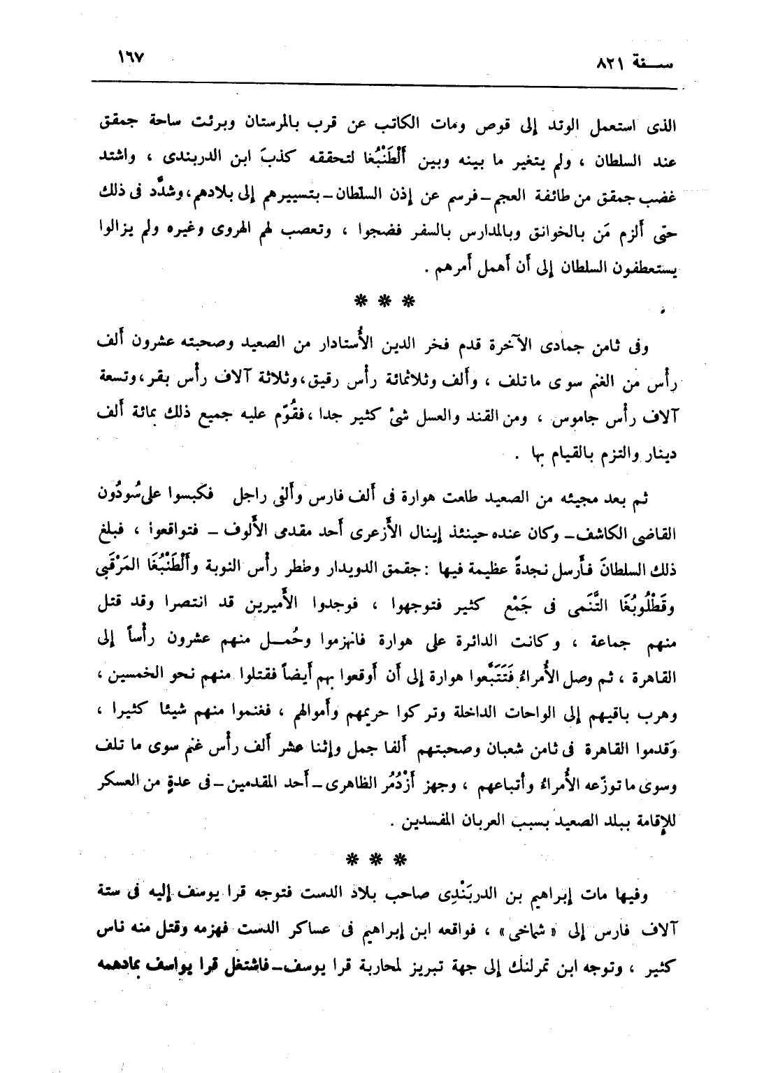 الذي استعمل الوتد إلى قوص، ومات الكاتب عن قرب بالمارستان، وبرئت ساحة جقمق عند السلطان ولم يتغير ما بينه وبين الطنبغا الصغير لتحققه كذب ابن الدربندي. واشتد غضب جقمق من طائفة العجم، فرسم عن إذن السلطان بتسييرهم إلى بلادهم، وشدد في ذلك حتى ألزم من بالخوانق وبالمدارس بالسفر فضجوا وتعصب لهم الهروي وغيره، ولم يزالوا يستعطفون السلطان إلى أن أهمل أمرهم.