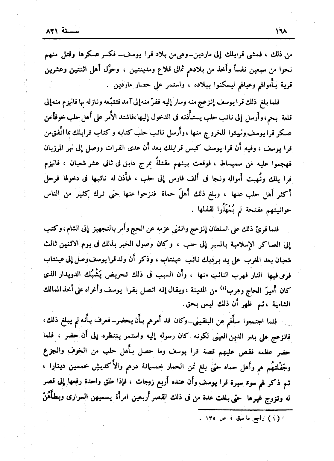 من ذلك، فمشى قرا يلك إلى ماردين وهي من بلاد قرا يوسف، فكسر عسكرها وقتل منهم نحواً من سبعين نفساً، واخذ من بلادها ثماني قلاع ومدينتين، وحول أهل اثنتين وعشرين قرية بأموالهم وعيالهم ليسكنهم ببلاده، واستمر على حصار ماردين، فلما بلغ ذلك قرا يوسف انزعج منه وسار، ففر منه إلى آمد فتبعه ونازله بها، فانهزم منه إلى قلعة نجم وأرسل إلى نائب حلب ليستأذنه في الدخول إليها، فاشتد الأمر عنه على أهل حلب خوفاً من عسكر قرا يوسف وتهيأوا للخروج منها، وأرسل نائب حلب كتابه وكتاب قرا يلك بما اتفق من قرا يوسف.