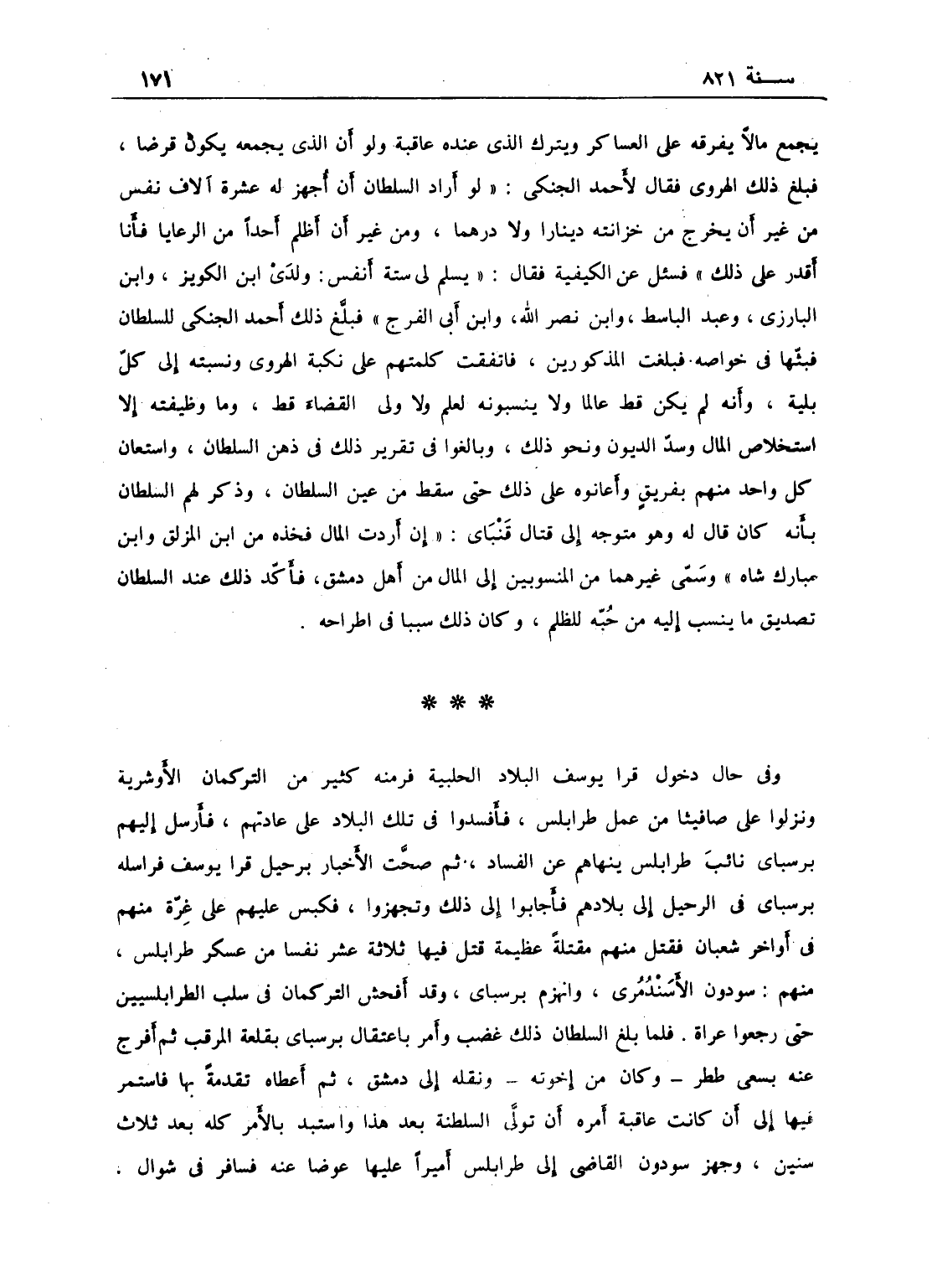 وفي حال دخول قرا يوسف البلاد الحلبية فر منه كثير من التركمان الأوشرية وغيرهم فنزلوا على صافيتا من عمر طرابلس فافسدوا في تلك البلاد على عادتهم، فأرسل م برسباي نائب طرابلس ينهاهم عن الفساد. ثم صحت الأخبار برحيل قرا يوسف فراسلهم برسباي في الرحيل إلى بلادهم، فأجابوا إلى ذلك وتجهزوا، فكبس عليهم على غرة منهم في أواخر شعبان، فقتل منهم مقتلة عظيمة قتل فيها ثلاثة عشر نفساً من عسكر طرابلس منهم سودون الأسندمري وانهزم برسباي، وقد أفحش التركمان في سلب الطرابلسيين حتى رجعوا عراة، فلما بلغ ذلك السلطان غضب وأمر باعتقال برسباي بقلعة المرقب، ثم أفرج عنه بسعي ططر وكان من إخوته ونقله إلى دمشق ثم أعطاه تقدمة بها، فاستمر فيها إلى أن كان عاقبة أمره أن تولى السلطنة بعد هذا، واستبد بالأمر كله بعد ثلاث سنين، وجهز سودون القاضي إلى طرابلس أميراً عليها عوضاً عنه، فسافر في شوال.