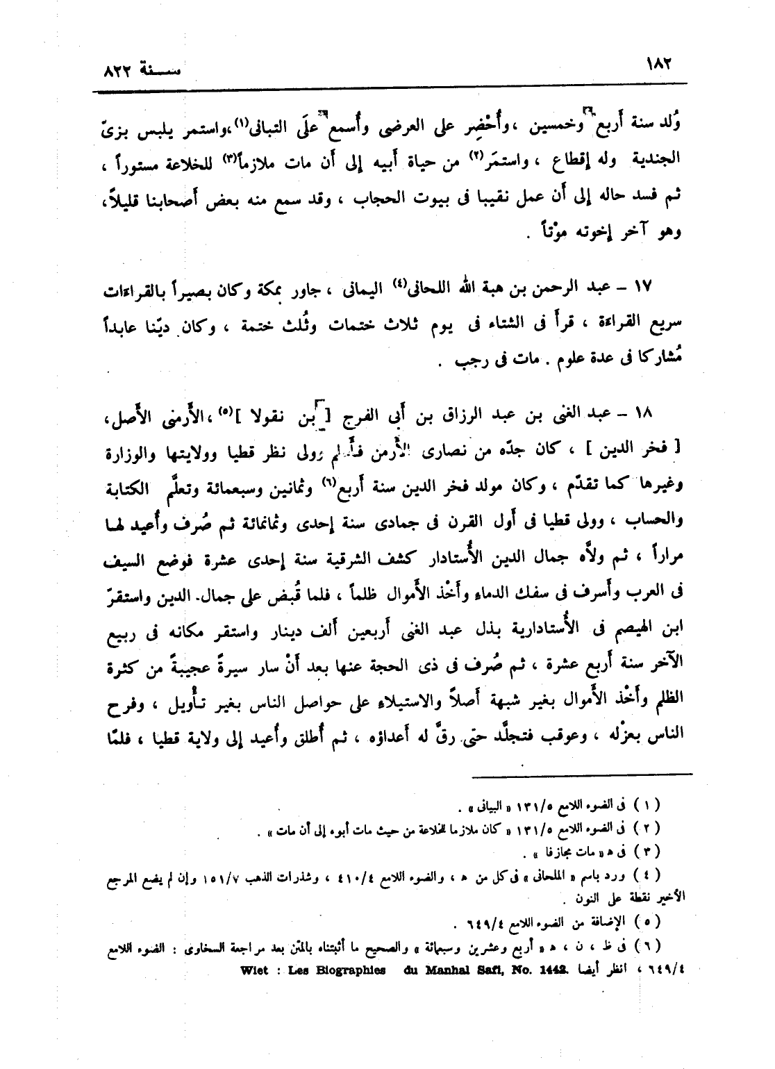عبد الغني بن عبد الرزاق بن أبي الفرج، الأرمني الأصل، كان جده من نصارى الأرمن فأسلم وولي نظر قطياً وولايتها والوزارة وغيرهما كما تقدم، وكان مولد فخر الدين سنة أربع وعشرين وسبعمائة، وتعلم الكتابة والحساب، وولي قطيا في راس القرن في جمادى سنة إحدى وثمانمائة، ثم صرف وأعيد لها مراراً، ثم ولاه جمال الدين الأستادار كشف الشرقية سنة إحدى عشرة، فوضع السيف في العرب وأسرف في سفك الدماء وأخذ الأموال، فلما قبض على جمال الدين واستقر ابن الهيصم في الأستادارية بذل عبد الغني أربعين ألف دينار، واستقر مكانه في ربيع الآخر سنة أربع عشرة، ثم صرف في ذي الحجة منها بعد أن سار سيرة عجيبة من كثرة الظلم وأخذ المال بغير شبهة أصلاً والاستيلاء على حواصل الناس بغير تأويل، وفرح الناس بعزله، وعوقب فتجلد حتى رق له أعداؤه، ثم أطلق وأعيد إلى ولاية قطيا، فلما
