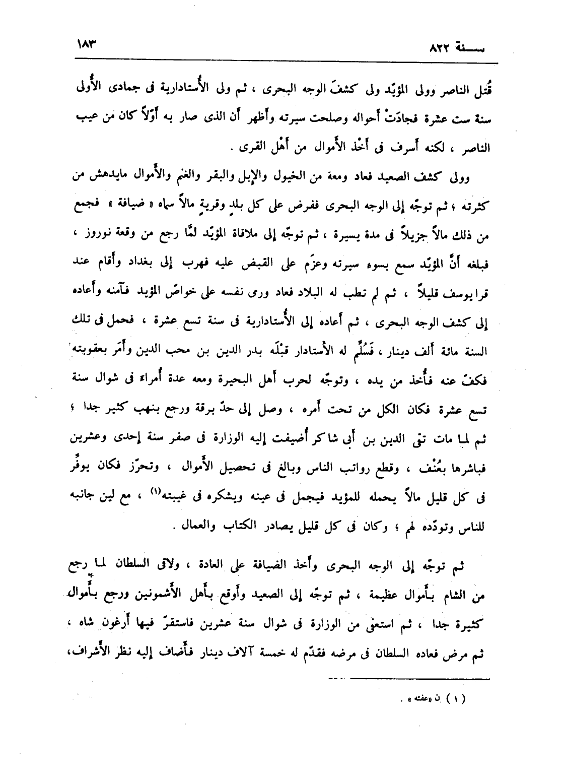 قتل الناصر وولي المؤيد ولي كشف الوجه البحري، ثم ولي الأستادارية في جمادى الأولى سنة ست عشرة، فجادت أحواله وصلحت سيرته وأظهر أن الذي سار به أولاً إنما كان من عيب الناصر لكنه أسرف في أخذ الأموال من أهل القرى، وولي كشف الصعيد فعاد ومعه من الخيول والإبل والبقر والغنم والأموال ما يدهش من كثرته، ثم توجه إلى الوجه البحري ففرض على كل بلد وقرية مالاً سماه ضيافة، فجمع من ذلك مالاً جزيلاً في مدة يسيرة، ثم توجه إلى ملاقاة المؤيد لما رجع من وقعة نوروز فبلغه أن المؤيد سمع بسوء سيرته وعزم على القبض عليه، فهرب إلى بغداد وأقام عند قرا يوسف قليلاً، ثم لم تطب له البلاد فعاد ورمى بنفسه على خواص المؤيد، فأمنه وأعاده إلى كشف الوجه البحري، ثم أعاده إلى الأستادارية في سنة تسع عشرة، فحمل في تلك السنة مائة ألف دينار فسلم له الأستادار قبله بدر الدين بن محب الدين وأمر بعقوبته، فكف عنه فأخذ من يده وتوجه لحرب أهل البحيرة ومعه عدة أمراء في شوال سنة تسع عشرة فكان الكل من تحت أمره، ووصل إلى حد برقة ورجع بنهب كثير جداً، ثم لما مات تقي الدين ابن أبي شاكر أضيفت الوزارة في صفر سنة إحدى وعشرين، فباشرها بعنف وقطع رواتب الناس وبالغ في تحصيل الأموال ويحوزة، فكان يوفر كل قليل مالاً يحمله للمؤيد فيجل في عينه ويشكره في غيبته مع لين جانبه للناس وتودده لهم، وكان في كل قليل يصادر الكتاب والعمال، ثم توجه إلى الوجه البحري وأخذ الضيافة على العادة ولاقى السلطان لما رجع من الشام بأموال عظيمة. ثم توجه إلى الصعيد وأوقع بأهل الأشمونين ورجع بأموال كثيرة جداً، ثم استعفى عن الوزارة في شوال سنة عشرين فاستقر أرغون شاه، ثم مرض فعاده السلطان في مرضه، فقدم له خمسة آلاف دينار فأضاف نظر الإشراف،
