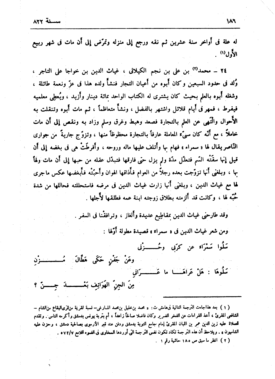 محمد بن علي بن نم، الكيلاني غياث الدين ابن خواجا على التاجر، ولد في حدود السبعين، وكان أبوه من أعيان التجار فنشأ ولده هذا في عز ونعمة طائلة، ثم شغله أبوه بالعلم بحيث كان يشتري له الكتاب الواحد بمائة دينار وأزيد ويعطي معلميه فيفرط، فمهر في أيام قلائل واشتهر بالفضل ونشأ متعاظماً، ثم مات أبوه وتنقلت به الأحوال، والتهى عن العلم بالتجارة فصعد وهبط وغرق وسلم وزاد ونقص إلى أن مات خاملاً مع أنه كان سيئ المعاملة عارفاً بالتجارة محظوظاً منها إلا أنه تزوج جارية من جواري الناصر يقال لها سمراء فهام بها وأتلف عليها ماله وروحه وأفرطت هي في بغضه إلى أن قيل إنها سقته السم فتعلل مدة ولم تزل به حتى فارقها فتدله عقله من حبها إلى أن مات ولهاً بها، وبلغني أنها تزوجت بعده رجلاً من العوام فأذاقها الهوان وأحبته، فأبغضها عكس ما جرى لها مع غياث الدين، وبلغني أنها زارت غياث الدين في مرضه واستحللته فحاللها من شدة حبه لها وكانت قد ألزمته بطلاق زوجته ابنة عمه فطلقها لأجلها، وقد طارحني غياث الدين بمقاطيع عديدة وألغاز وترافقنا في السفر، ومن شعر غياث الدين في سمراء قصيدة مطولة أولها: